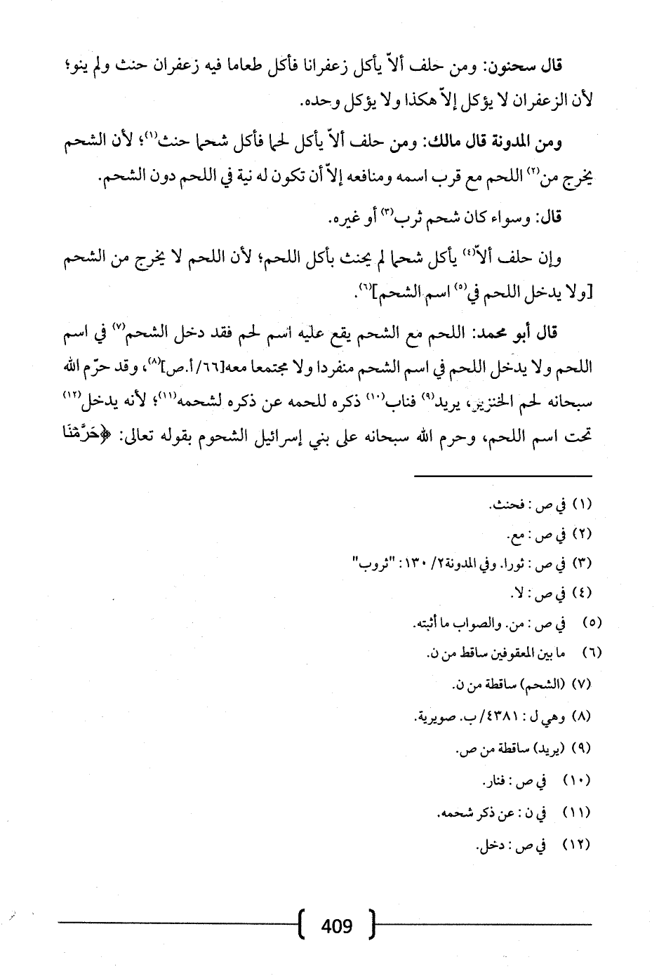قال أبو محمد: اللحم مع الشحم يقع عليه اسم لحم فقد دخل الشحم في اسم اللحم ولا يدخل اللحم في اسم الشحم منفرداً ولا مجتمعاً معه، وقد حرم الله سبحانه لحم الخنزير، يريد فناب ذكره للحمه عن ذكره لشحمه؛ لأنه يدخل تحت اسم اللحم، وحرم الله سبحانه على بني إسرائيل الشحوم بقوله تعالى: {حَرَّمْنَا