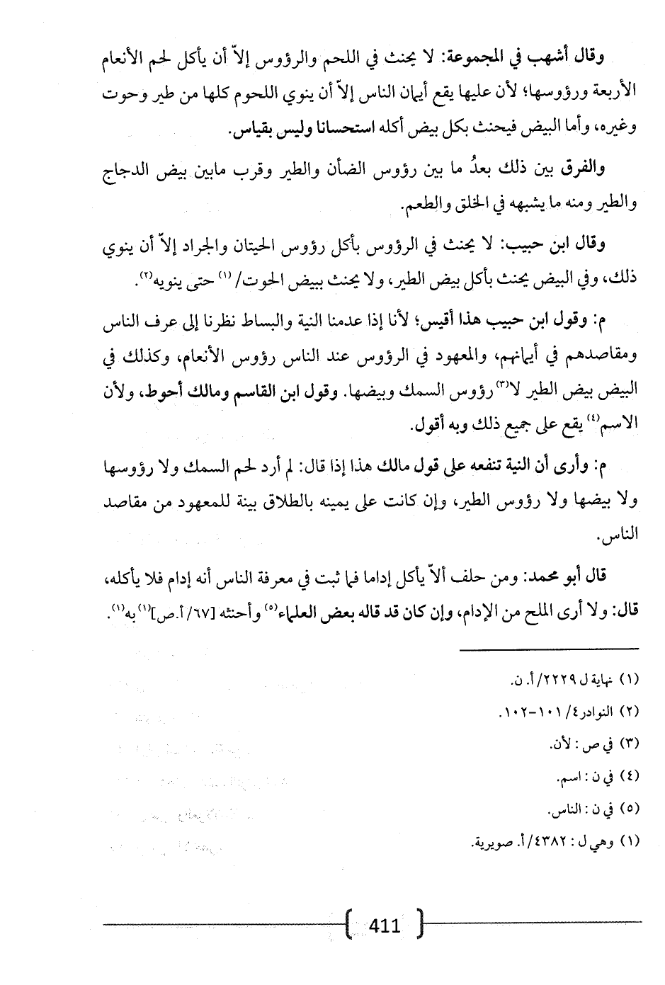 م: وقول ابن حبيب هذا أقيس؛ لأنا إذا عدمنا النية والبساط نظرنا إلى عرف الناس ومقاصدهم في أيمانهم، والمعهود في الرؤوس عند الناس رؤوس الأنعام، وكذلك في البيض بيض الطير لا رؤوس السمك وبيضها. وقول ابن القاسم ومالك أحوط، ولأن الاسم يقع على جميع ذلك وبه أقول.