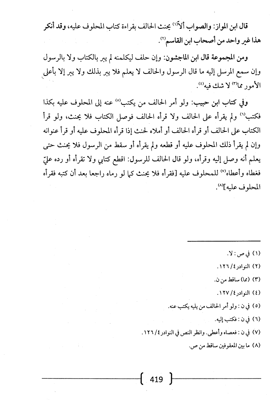 قال ابن المواز: والصواب ألا يحنث الحالف بقراءة كتاب المحلوف عليه، وقد أنكر هذا غير واحد من أصحاب ابن القاسم.