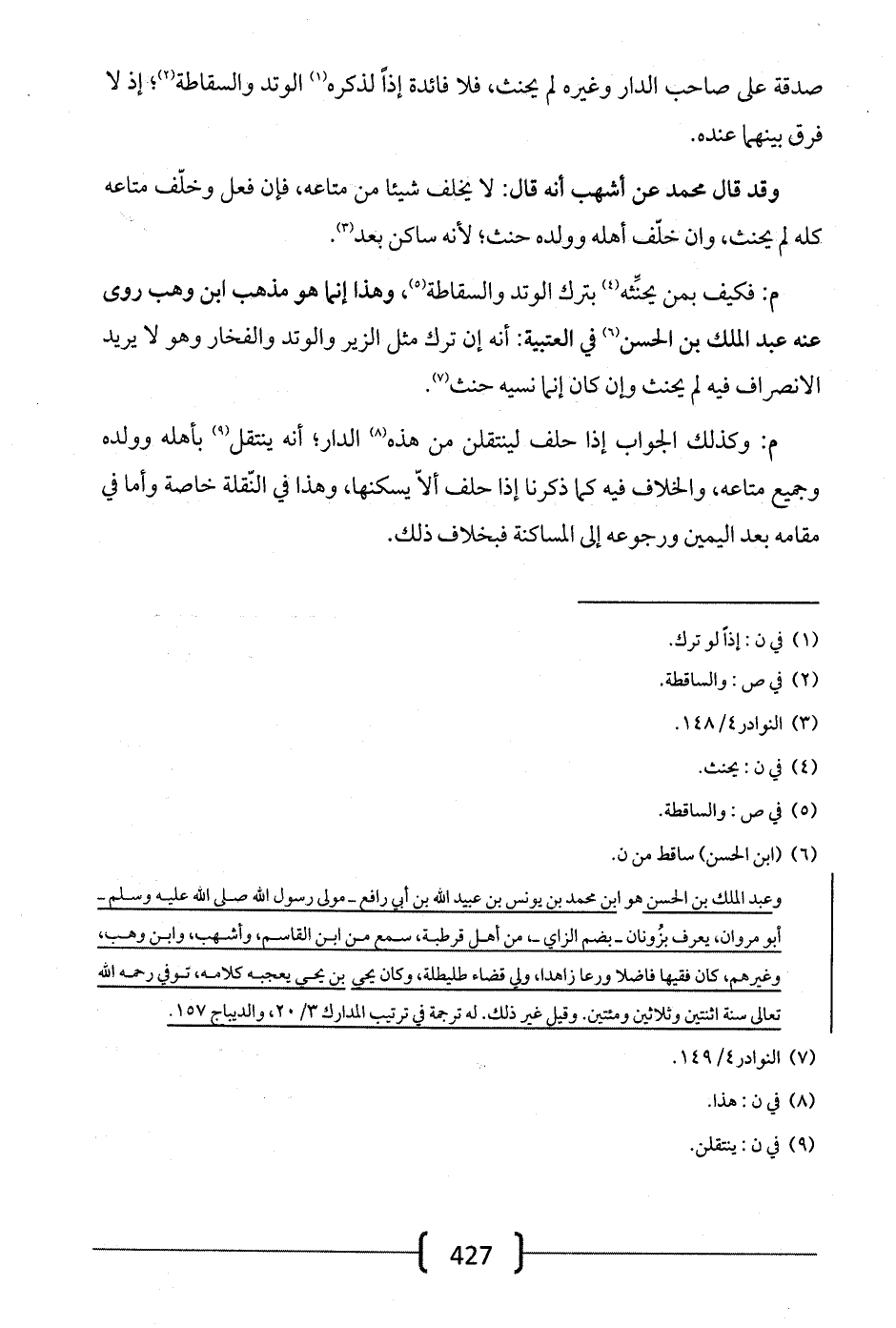 م: فكيف بمن يحنثه بترك الوتد والسقاطة، وهذا إنما هو مذهب ابن وهب روى عنه عبد الملك بن الحسن في العتبية: أنه إن ترك مثل الزير الوتد والفخار وهو لا يريد الانصراف فيه لم يحنث وإن كان إنما نسيه حنث.