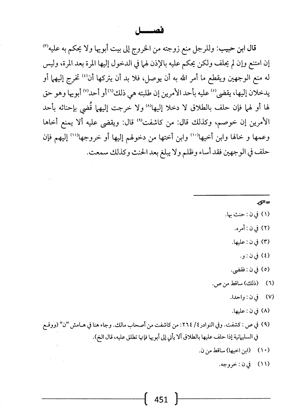 قال ابن حبيب: وللرجل منع زوجته من الخروج إلى بيت أبويها ولا يحكم به عليه إن امتنع وإن لم يحلف ولكن يحكم عليه بالإذن لهما في الدخول إليها المرة بعد المرة، وليس له منع الوجهين ويقطع ما أمر الله به أن يوصل، فلا بد أن يتركها أن تخرج إليهما أو يدخلان إليها، يقضي عليه بأحد الأمرين إن طلبته هي ذلك أو أحد أبويها وهو حق لها أو لهما فإن حلف بالطلاق لا دخلا إليها ولا خرجت إليهما قضي بإحناثه بأحد الأمرين إن خوصم، وكذلك قال: من كاشفت قال: ويقضى عليه ألا يمنع أخاها وعمها وخالها وابن أخيها وابن أختها من دخولهم إليها أو خروجها إليهم فإن حلف في الوجهين فقد أساء وظلم ولا يبلغ بعد الحنث وكذلك سمعت.