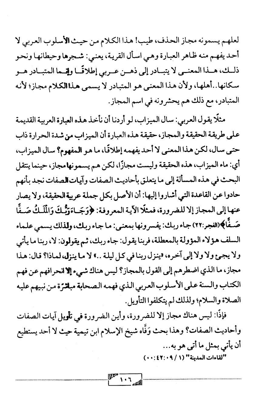 مثلًا يقول العربي: سال الميزاب، لو أردنا أن نأخذ هذه العبارة العربية القديمة على طريقة الحقيقة والمجاز، حقيقة هذه العبارة أن الميزاب من شدة الحرارة ذاب حتى سال، لكن هذا المعنى لا أحد يفهمه إطلاقًا، ما هو المفهوم؟ سال الميزاب، أي: ماء الميزاب، هذه الحقيقة وليست مجازًا، لكن هم يسمونها مجاز، حينما ينتقل البحث في هذه المسألة إلى ما يتعلق بأحاديث الصفات وآيات الصفات نجد بأنهم حادوا عن القاعدة التي أشاروا إليها: أن الأصل بكل جملة عربية الحقيقة، ولا يصار عنها إلى المجاز إلا للضرورة، فمثلًا الآية المعروفة: {وَجَاءَ رَبُّكَ وَالْمَلَكُ صَفًّا صَفًّا} (الفجر:22) جاء ربك: يفسرونها بمعنى: ما جاء ربك، ولذلك يسمي علماء السلف هؤلاء المؤولة بالمعطلة، فربنا يقول: جاء ربك، ثم يقولون: لا، ربنا ما يأتي ولا يجئ ولا ولا إلى آخره، «ينزل ربنا في كل ليلة .. » لا ما ينزل، لماذا؟ قال: هذا مجاز، ما الذي اضطرهم إلى القول بالمجاز؟ ليس هناك شيء إلا انحرافهم عن فهم الكتاب والسنة على الأسلوب العربي الذي فهمه الصحابة مباشرًة من نبيهم عليه الصلاة والسلام؛ ولذلك لم يتكلفوا التأويل.
