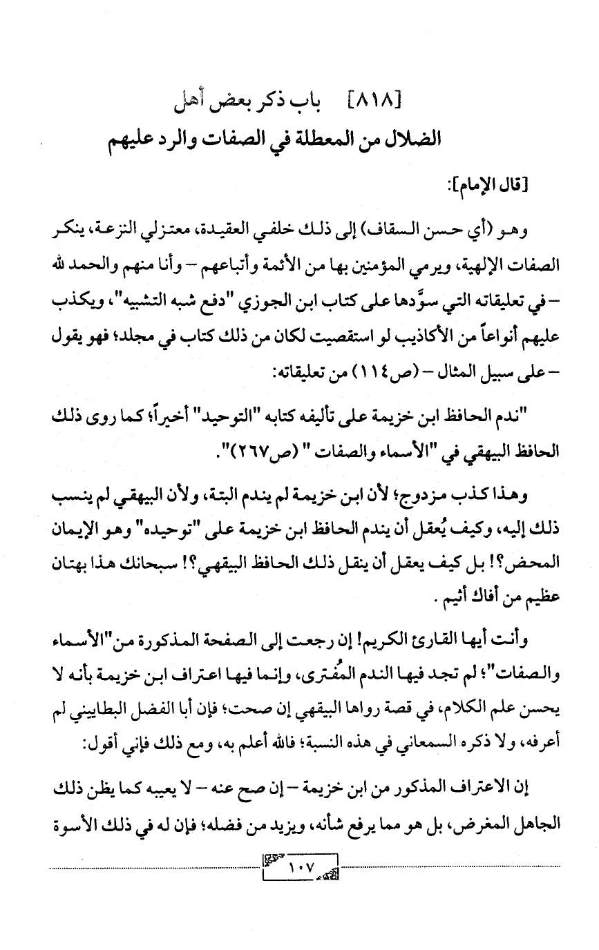 وأنت أيها القارئ الكريم! إن رجعت إلى الصفحة المذكورة من"الأسماء والصفات"؛ لم تجد فيها الندم المُفترى، وإنما فيها اعتراف ابن خزيمة بأنه لا يحسن علم الكلام، في قصة رواها البيقهي إن صحت؛ فإن أبا الفضل البطاييني لم أعرفه، ولا ذكره السمعاني في هذه النسبة؛ فالله أعلم به، ومع ذلك فإني أقول: