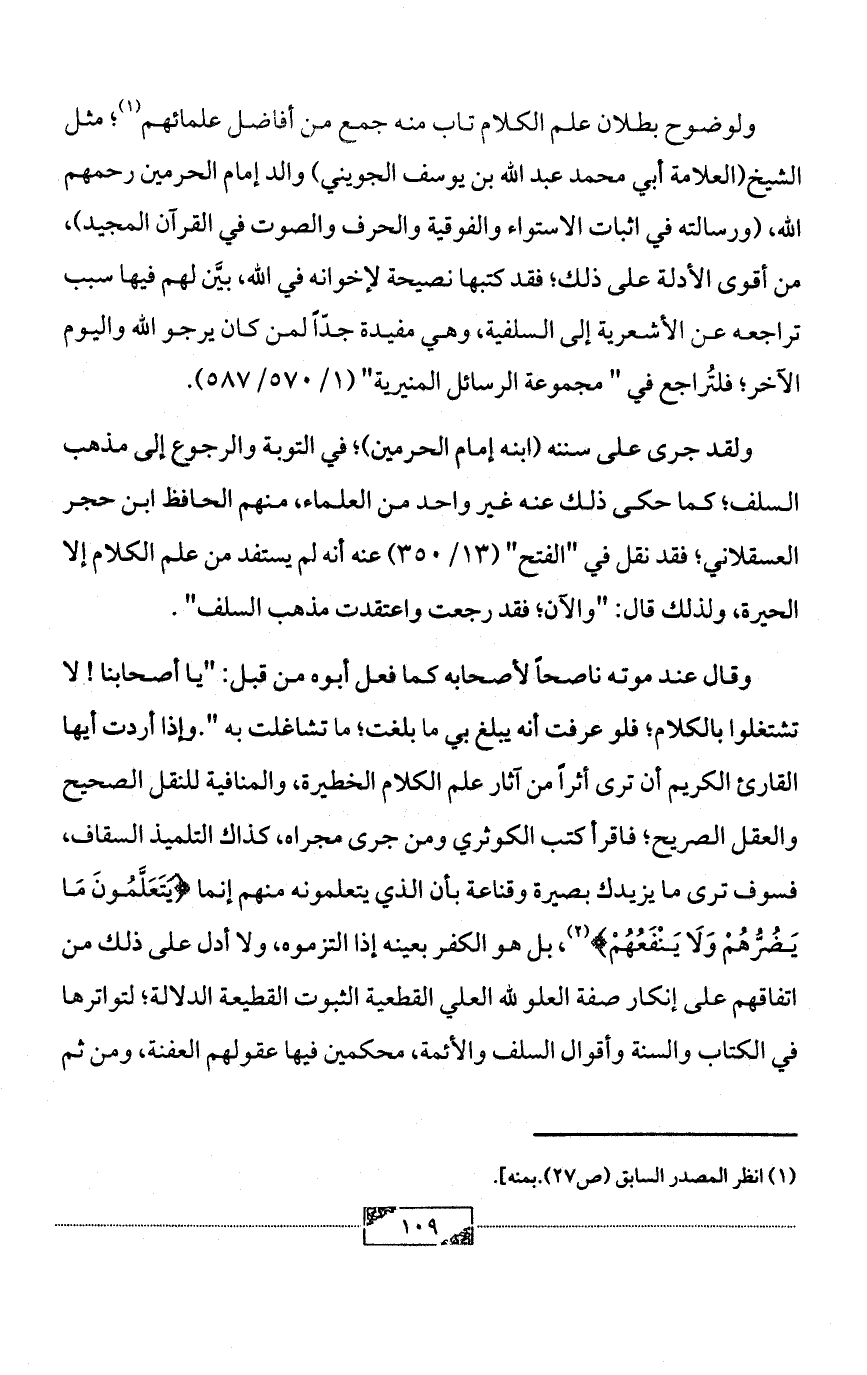 ولوضوح بطلان علم الكلام تاب منه جمع من أفاضل علمائهم (¬1)؛ مثل الشيخ (العلامة أبي محمد عبد الله بن يوسف الجويني) والد إمام الحرمين رحمهم الله، (ورسالته في اثبات الاستواء والفوقية والحرف والصوت في القرآن المجيد)، من أقوى الأدلة على ذلك؛ فقد كتبها نصيحة لإخوانه في الله، بيَّن لهم فيها سبب تراجعه عن الأشعرية إلى السلفية، وهي مفيدة جدّاً لمن كان يرجو الله واليوم الآخر؛ فلتُراجع في " مجموعة الرسائل المنيرية" (1/ 570/587).
