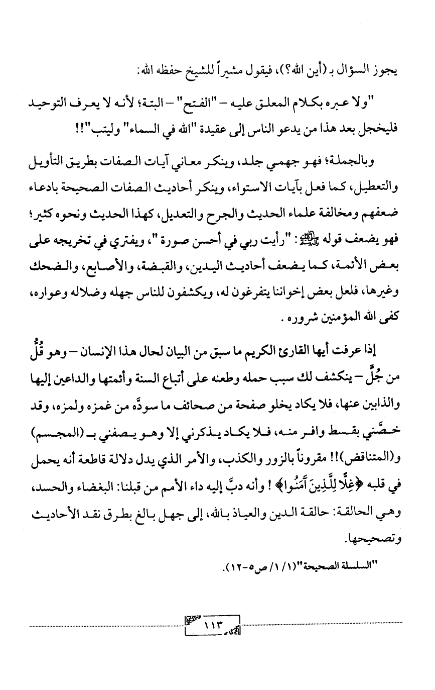 وبالجملة؛ فهو جهمي جلد، وينكر معاني آيات الصفات بطريق التأويل والتعطيل، كما فعل بآيات الاستواء، وينكر أحاديث الصفات الصحيحة بادعاء ضعفهم ومخالفة علماء الحديث والجرح والتعديل، كهذا الحديث ونحوه كثير؛ فهو يضعف قوله - صلى الله عليه وآله وسلم -: "رأيت ربي في أحسن صورة "، ويفتري في تخريجه على بعض الأئمة، كما يضعف أحاديث اليدين, والقبضة, والأصابع, والضحك وغيرها، فلعل بعض إخواننا يتفرغون له، ويكشفون للناس جهله وضلاله وعواره، كفى الله المؤمنين شروره.
