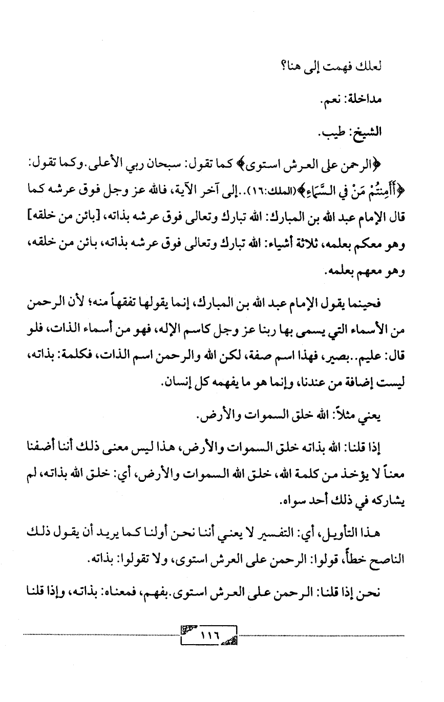 فحينما يقول الإمام عبد الله بن المبارك، إنما يقولها تفقهاً منه؛ لأن الرحمن من الأسماء التي يسمى بها ربنا عز وجل كاسم الإله، فهو من أسماء الذات، فلو قال: عليم .. بصير، فهذا اسم صفة، لكن الله والرحمن اسم الذات، فكلمة: بذاته، ليست إضافة من عندنا، وإنما هو ما يفهمه كل إنسان.