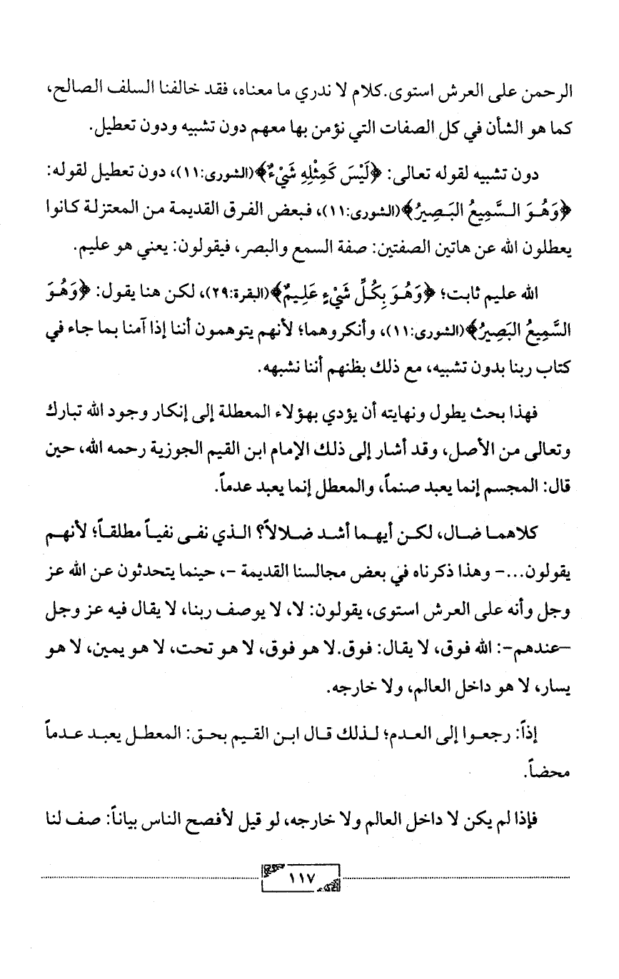 دون تشبيه لقوله تعالى: {لَيْسَ كَمِثْلِهِ شَيْءٌ} (الشورى:11)، دون تعطيل لقوله: {وَهُوَ السَّمِيعُ البَصِيرُ} (الشورى:11)، فبعض الفرق القديمة من المعتزلة كانوا يعطلون الله عن هاتين الصفتين: صفة السمع والبصر، فيقولون: يعني هو عليم.