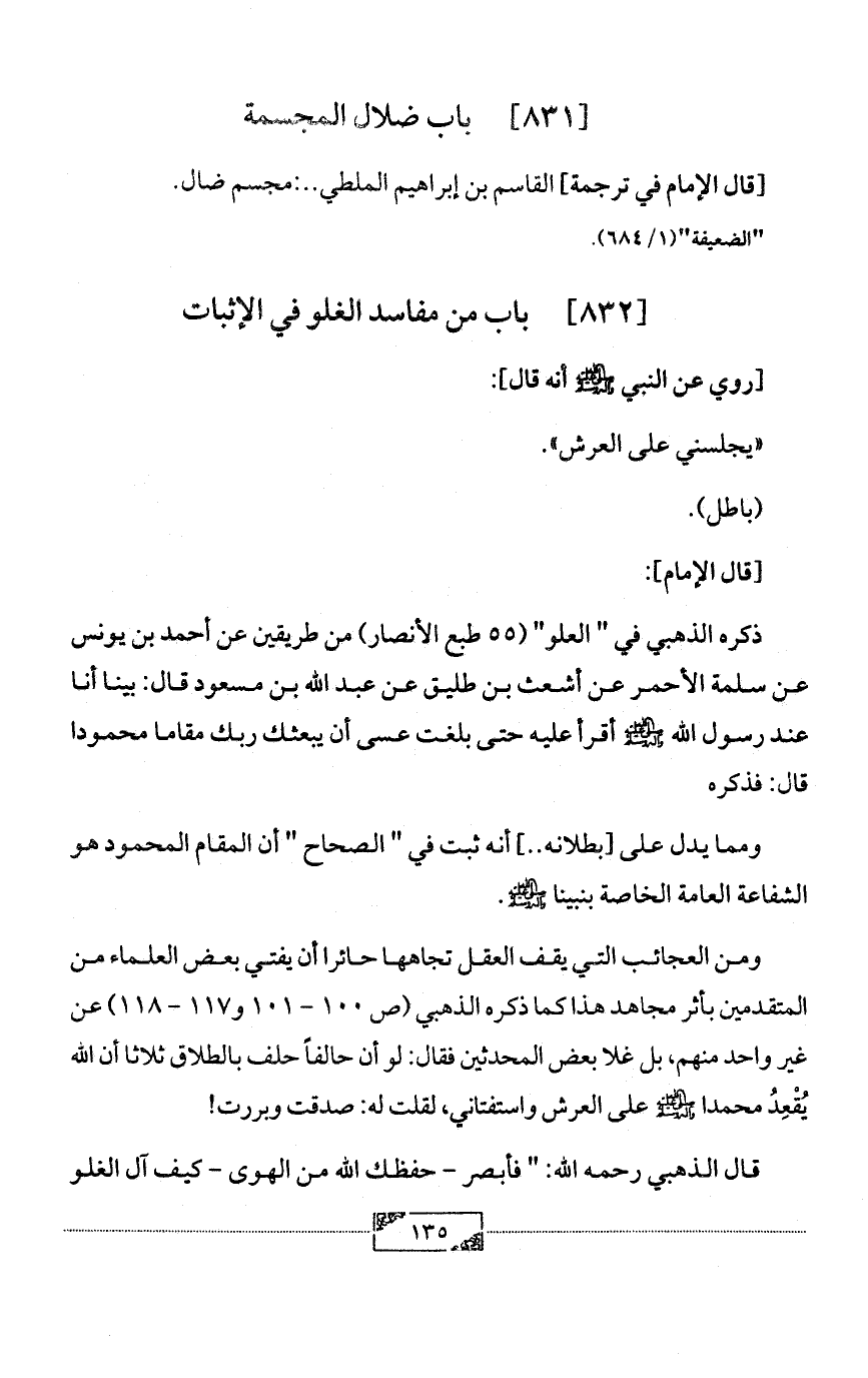 ومن العجائب التي يقف العقل تجاهها حائرا أن يفتي بعض العلماء من المتقدمين بأثر مجاهد هذا كما ذكره الذهبي (ص 100 - 101 و117 - 118) عن غير واحد منهم، بل غلا بعض المحدثين فقال: لو أن حالفاً حلف بالطلاق ثلاثا أن الله يُقْعِدُ محمدا - صلى الله عليه وآله وسلم - على العرش واستفتاني، لقلت له: صدقت وبررت!