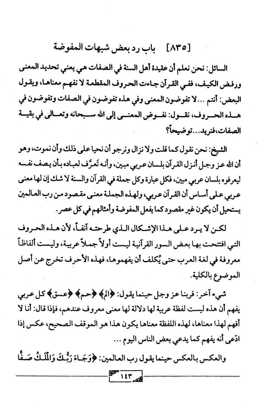 السائل: نحن نعلم أن عقيدة أهل السنة في الصفات هي يعني تحديد المعنى ورفض الكيف، ففي القرآن جاءت الحروف المقطعة لا نفهم معناها، ويقول البعض: أنتم ... لا تفوضون المعنى وفي هذه تفوضون في الصفات وتفوضون في هذه الحروف، نقول: نفوض المعنى إلى الله سبحانه وتعالى في بقية الصفات، فنريد ... توضيحاً؟