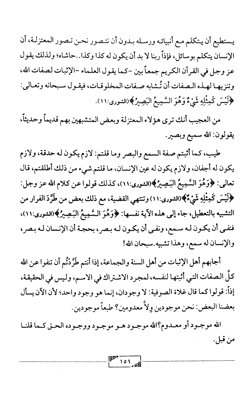 يستطيع أن يتكلم مع أنبيائه ورسله بدون أن نتصور نحن تصور المعتزلة، أن الإنسان يتكلم بوسائل، فإذاً ربنا لا بد أن يكون له كذا وكذا .. حاشاه؛ ولذلك يقول عز وجل في القرآن الكريم جمعاً بين -كما يقول العلماء -الإثبات لصفات الله، وتنزيها لهذه الصفات أن تُشابه صفات المخلوقات، فيقول سبحانه وتعالى: {لَيْسَ كَمِثْلِهِ شَيْءٌ وَهُوَ السَّمِيعُ البَصِيرُ} (الشورى:11).