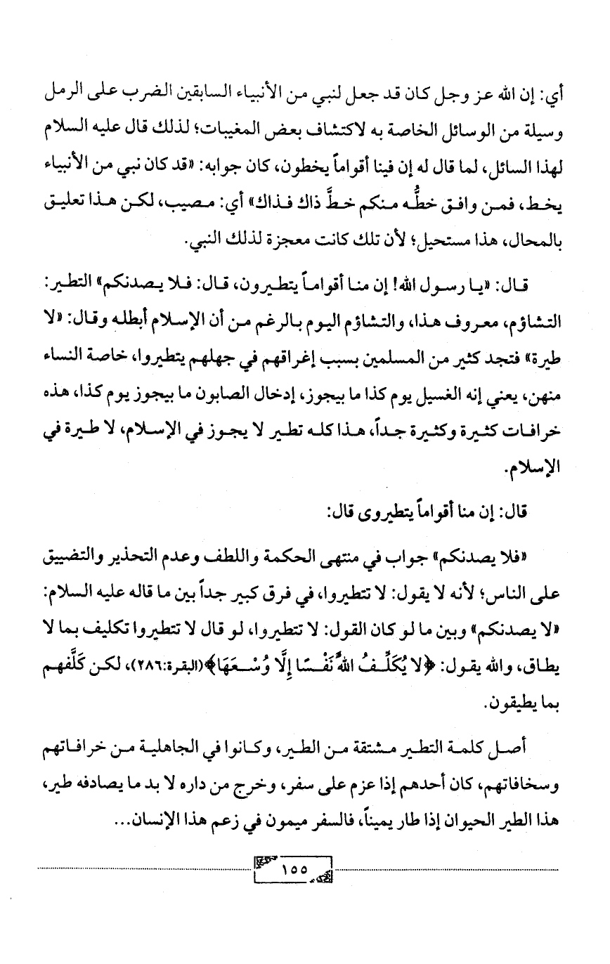 قال: «يا رسول الله! إن منا أقواماً يتطيرون، قال: فلا يصدنكم» التطير: التشاؤم، معروف هذا، والتشاؤم اليوم بالرغم من أن الإسلام أبطله وقال: «لا طيرة» فتجد كثير من المسلمين بسبب إغراقهم في جهلهم يتطيروا، خاصة النساء منهن، يعني إنه الغسيل يوم كذا ما بيجوز، إدخال الصابون ما بيجوز يوم كذا، هذه خرافات كثيرة وكثيرة جداً، هذا كله تطير لا يجوز في الإسلام، لا طيرة في الإسلام.
