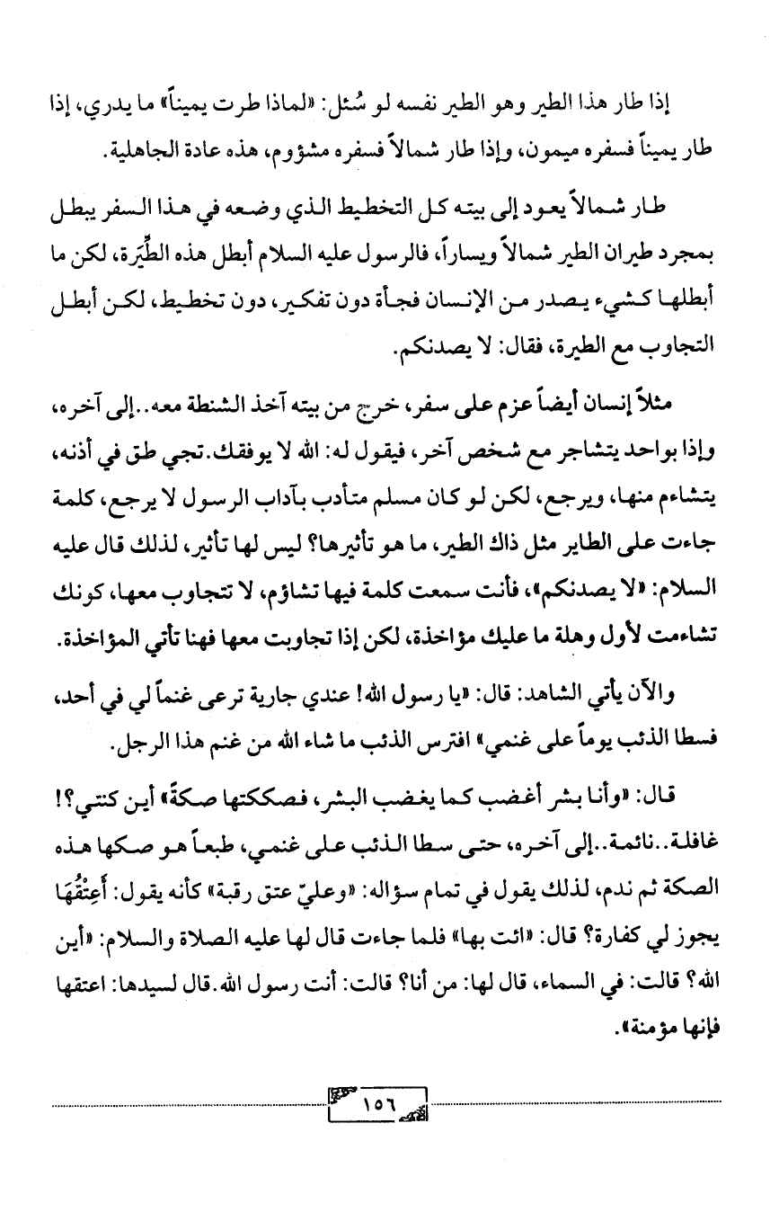 مثلاً إنسان أيضاً عزم على سفر، خرج من بيته آخذ الشنطة معه .. إلى آخره، وإذا بواحد يتشاجر مع شخص آخر، فيقول له: الله لا يوفقك. تجي طق في أذنه، يتشاءم منها، ويرجع، لكن لو كان مسلم متأدب بآداب الرسول لا يرجع، كلمة جاءت على الطاير مثل ذاك الطير، ما هو تأثيرها؟ ليس لها تأثير، لذلك قال عليه السلام: «لا يصدنكم»، فأنت سمعت كلمة فيها تشاؤم، لا تتجاوب معها، كونك تشاءمت لأول وهلة ما عليك مؤاخذة، لكن إذا تجاوبت معها فهنا تأتي المؤاخذة.