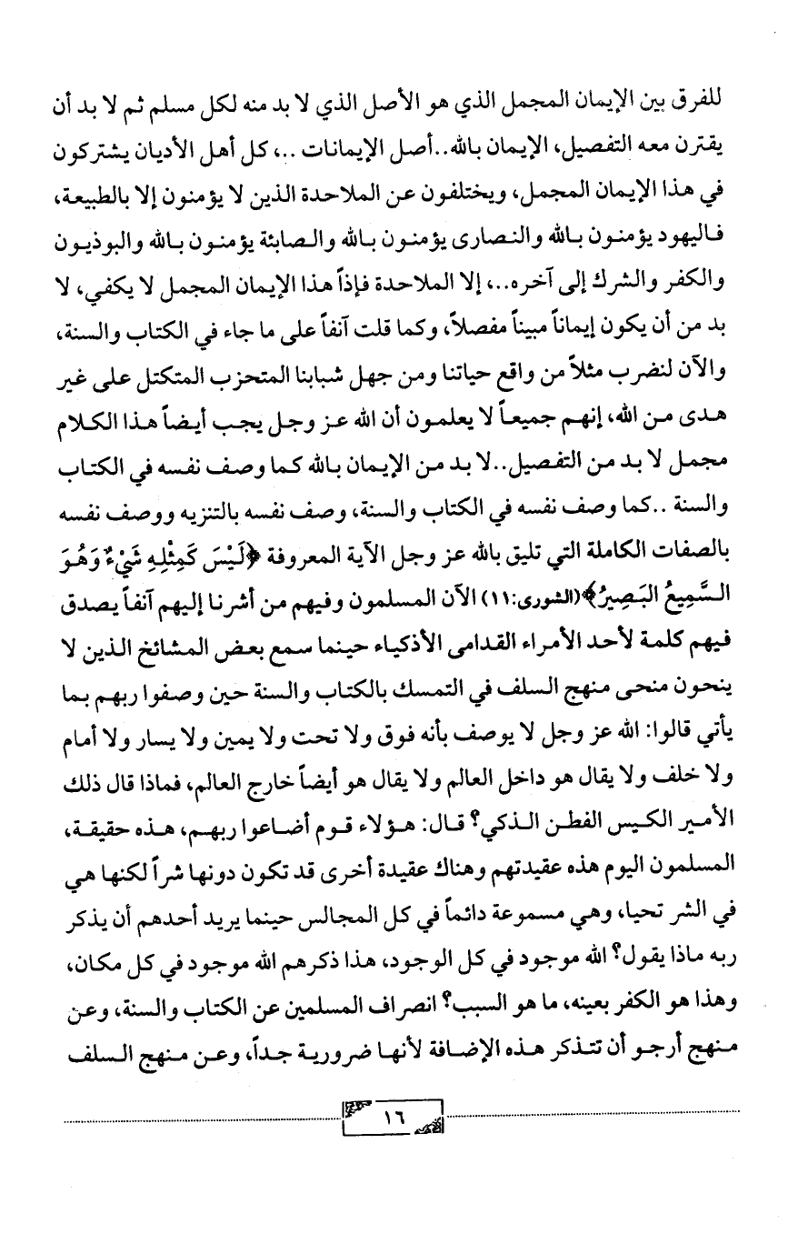 للفرق بين الإيمان المجمل الذي هو الأصل الذي لا بد منه لكل مسلم ثم لا بد أن يقترن معه التفصيل، الإيمان بالله .. أصل الإيمانات .. ، كل أهل الأديان يشتركون في هذا الإيمان المجمل، ويختلفون عن الملاحدة الذين لا يؤمنون إلا بالطبيعة، فاليهود يؤمنون بالله والنصارى يؤمنون بالله والصابئة يؤمنون بالله والبوذيون والكفر والشرك إلى آخره .. ، إلا الملاحدة فإذاً هذا الإيمان المجمل لا يكفي، لا بد من أن يكون إيماناً مبيناً مفصلاً، وكما قلت آنفاً على ما جاء في الكتاب والسنة، والآن لنضرب مثلاً من واقع حياتنا ومن جهل شبابنا المتحزب المتكتل على غير هدى من الله، إنهم جميعاً لا يعلمون أن الله عز وجل يجب أيضاً هذا الكلام مجمل لا بد من التفصيل .. لا بد من الإيمان بالله كما وصف نفسه في الكتاب والسنة .. كما وصف نفسه في الكتاب والسنة، وصف نفسه بالتنزيه ووصف نفسه بالصفات الكاملة التي تليق بالله عز وجل الآية المعروفة {لَيْسَ كَمِثْلِهِ شَيْءٌ وَهُوَ السَّمِيعُ البَصِيرُ} (الشورى:11) الآن المسلمون وفيهم من أشرنا إليهم آنفاً يصدق فيهم كلمة لأحد الأمراء القدامى الأذكياء حينما سمع بعض المشائخ الذين لا ينحون منحى منهج السلف في التمسك بالكتاب والسنة حين وصفوا ربهم بما يأتي قالوا: الله عز وجل لا يوصف بأنه فوق ولا تحت ولا يمين ولا يسار ولا أمام ولا خلف ولا يقال هو داخل العالم ولا يقال هو أيضاً خارج العالم، فماذا قال ذلك الأمير الكيس الفطن الذكي? قال: هؤلاء قوم أضاعوا ربهم، هذه حقيقة، المسلمون اليوم هذه عقيدتهم وهناك عقيدة أخرى قد تكون دونها شراً لكنها هي في الشر تحيا، وهي مسموعة دائماً في كل المجالس حينما يريد أحدهم أن يذكر ربه ماذا يقول? الله موجود في كل الوجود، هذا ذكرهم الله موجود في كل مكان، وهذا هو الكفر بعينه، ما هو السبب? انصراف المسلمين عن الكتاب والسنة، وعن منهج أرجو أن تتذكر هذه الإضافة لأنها ضرورية جداً، وعن منهج السلف