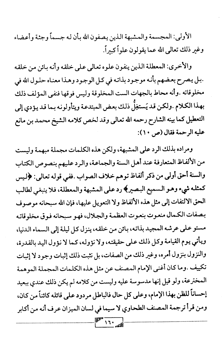 والأخرى: المعطلة الذين ينفون علوه تعالى على خلقه وأنه بائن من خلقه. بل يصرح بعضهم بأنه موجود بذاته في كل الوجود وهذا معناه حلول الله في مخلوقاته. وأنه محاط بالجهات الست المخلوقة وليس فوقها فنفى المؤلف ذلك بهذا الكلام. ولكن قد يَستغِلُّ ذلك بعض المبتدعة ويتأولونه بما قد يؤدي إلى التعطيل كما بينه الشارح رحمه الله تعالى وقد لخص كلامه الشيخ محمد بن مانع عليه الرحمة فقال (ص 10):