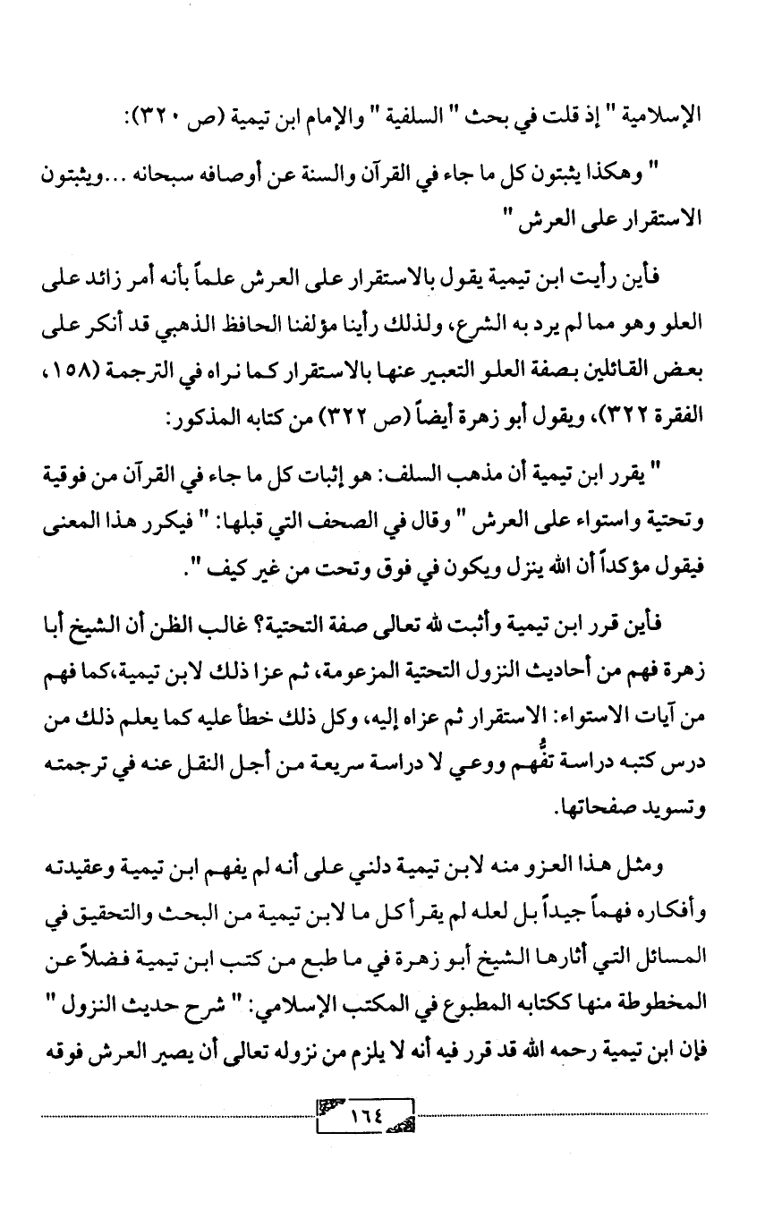 فأين رأيت ابن تيمية يقول بالاستقرار على العرش علماً بأنه أمر زائد على العلو وهو مما لم يرد به الشرع، ولذلك رأينا مؤلفنا الحافظ الذهبي قد أنكر على بعض القائلين بصفة العلو التعبير عنها بالاستقرار كما نراه في الترجمة (158، الفقرة 322)، ويقول أبو زهرة أيضاً (ص 322) من كتابه المذكور: