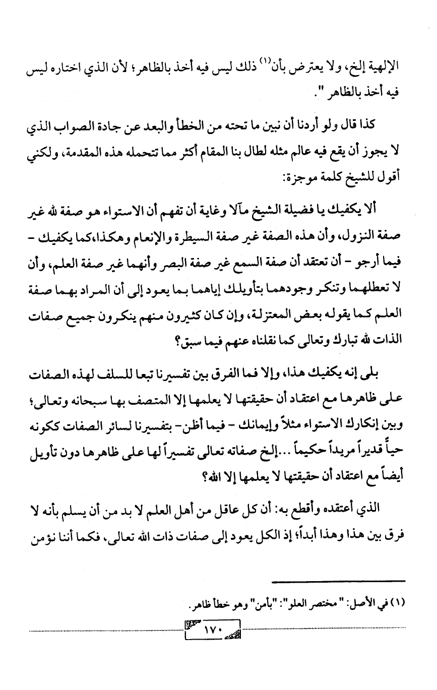 ألا يكفيك يا فضيلة الشيخ مآلا وغاية أن تفهم أن الاستواء هو صفة لله غير صفة النزول، وأن هذه الصفة غير صفة السيطرة والإنعام وهكذا، كما يكفيك - فيما أرجو - أن تعتقد أن صفة السمع غير صفة البصر وأنهما غير صفة العلم، وأن لا تعطلهما وتنكر وجودهما بتأويلك إياهما بما يعود إلى أن المراد بهما صفة العلم كما يقوله بعض المعتزلة، وإن كان كثيرون منهم ينكرون جميع صفات الذات لله تبارك وتعالى كما نقلناه عنهم فيما سبق؟