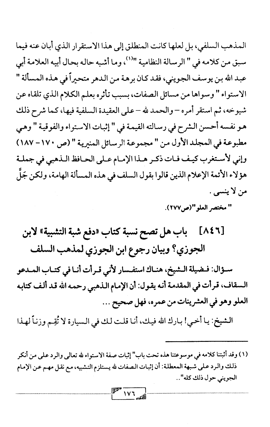 المذهب السلفي، بل لعلها كانت المنطلق إلى هذا الاستقرار الذي أبان عنه فيما سبق من كلامه في " الرسالة النظامية " (¬1) , وما أشبه حاله بحال أبيه العلامة أبي عبد الله بن يوسف الجويني، فقد كان برهة من الدهر متحيراً في هذه المسألة " الاستواء " وسواها من مسائل الصفات، بسبب تأثره بعلم الكلام الذي تلقاه عن شيوخه، ثم استقر أمره - والحمد لله - على العقيدة السلفية فيها، كما شرح ذلك هو نفسه أحسن الشرح في رسالته القيمة في " إثبات الاستواء والفوقية " وهي مطبوعة في المجلد الأول من " مجموعة الرسائل المنيرية " (ص 170 - 187) وإني لأستغرب كيف فات ذكر هذا الإمام على الحافظ الذهبي في جملة