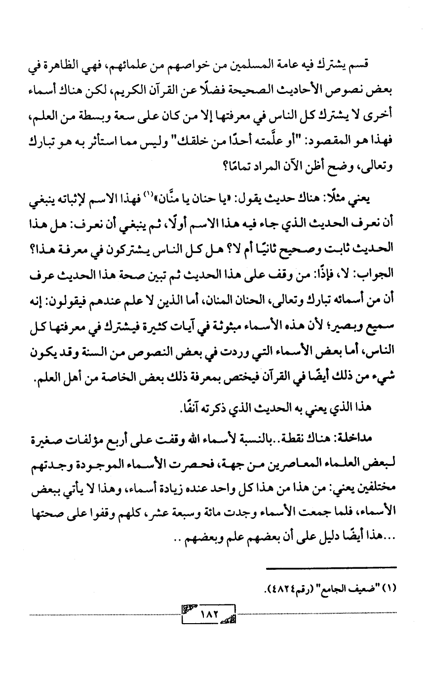 يعني مثلًا: هناك حديث يقول: «يا حنان يا منَّان» (¬1) فهذا الاسم لإثباته ينبغي أن نعرف الحديث الذي جاء فيه هذا الاسم أولًا، ثم ينبغي أن نعرف: هل هذا الحديث ثابت وصحيح ثانيًا أم لا؟ هل كل الناس يشتركون في معرفة هذا؟ الجواب: لا، فإذًا: من وقف على هذا الحديث ثم تبين صحة هذا الحديث عرف أن من أسمائه تبارك وتعالى، الحنان المنان، أما الذين لا علم عندهم فيقولون: إنه سميع وبصير؛ لأن هذه الأسماء مبثوثة في آيات كثيرة فيشترك في معرفتها كل الناس، أما بعض الأسماء التي وردت في بعض النصوص من السنة وقد يكون شيء من ذلك أيضًا في القرآن فيختص بمعرفة ذلك بعض الخاصة من أهل العلم.