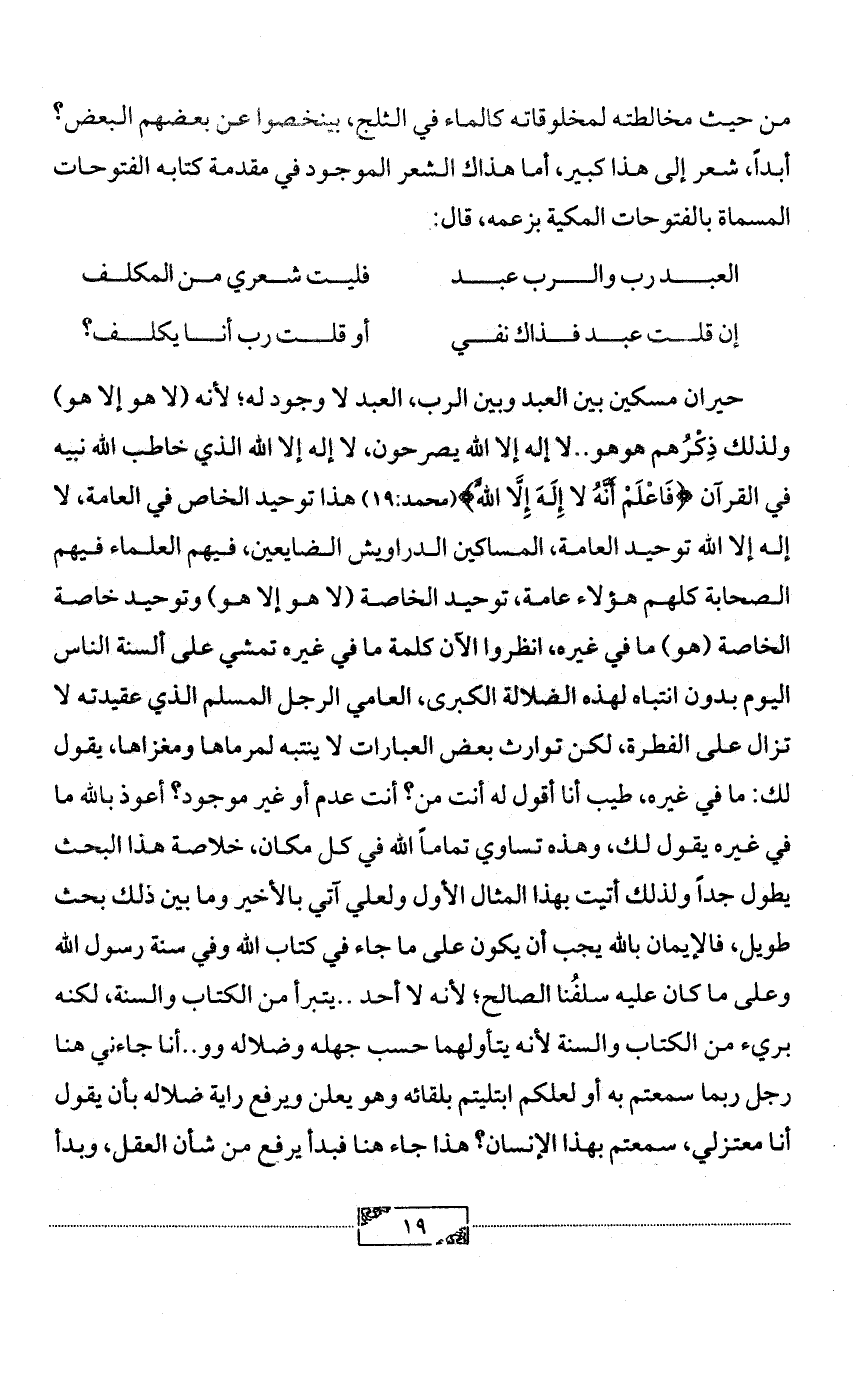 حيران مسكين بين العبد وبين الرب، العبد لا وجود له؛ لأنه (لا هو إلا هو) ولذلك ذِكْرُهم هوهو .. لا إله إلا الله يصرحون، لا إله إلا الله الذي خاطب الله نبيه في القرآن {فَاعْلَمْ أَنَّهُ لا إِلَهَ إِلَّا اللَّهُ} (محمد:19) هذا توحيد الخاص في العامة، لا إله إلا الله توحيد العامة، المساكين الدراويش الضايعين، فيهم العلماء فيهم الصحابة كلهم هؤلاء عامة، توحيد الخاصة (لا هو إلا هو) وتوحيد خاصة الخاصة (هو) ما في غيره، انظروا الآن كلمة ما في غيره تمشي على ألسنة الناس اليوم بدون انتباه لهذه الضلالة الكبرى، العامي الرجل المسلم الذي عقيدته لا تزال على الفطرة، لكن توارث بعض العبارات لا ينتبه لمرماها ومغزاها، يقول لك: ما في غيره، طيب أنا أقول له أنت من? أنت عدم أو غير موجود? أعوذ بالله ما في غيره يقول لك، وهذه تساوي تماماً الله في كل مكان، خلاصة هذا البحث يطول جداً ولذلك أتيت بهذا المثال الأول ولعلي آتي بالأخير وما بين ذلك بحث طويل، فالإيمان بالله يجب أن يكون على ما جاء في كتاب الله وفي سنة رسول الله وعلى ما كان عليه سلفُنا الصالح؛ لأنه لا أحد .. يتبرأ من الكتاب والسنة، لكنه بريء من الكتاب والسنة لأنه يتأولهما حسب جهله وضلاله وو .. أنا جاءني هنا رجل ربما سمعتم به أو لعلكم ابتليتم بلقائه وهو يعلن ويرفع راية ضلاله بأن يقول أنا معتزلي، سمعتم بهذا الإنسان? هذا جاء هنا فبدأ يرفع من شأن العقل، وبدأ