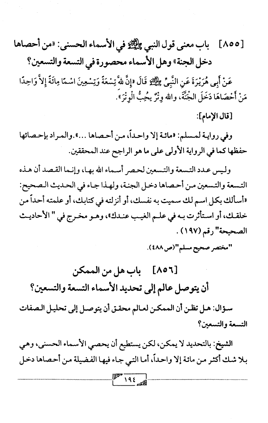 [855] باب معنى قول النبي - صلى الله عليه وآله وسلم - في الأسماء الحسنى: «من أحصاها دخل الجنة» وهل الأسماء محصورة في التسعة والتسعين؟