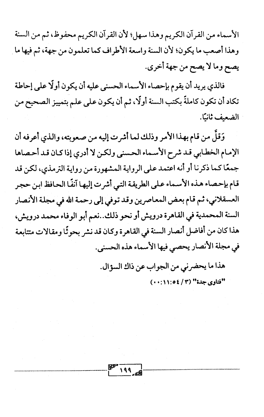 وَقلَّ من قام بهذا الأمر وذلك لما أشرت إليه من صعوبته، والذي أعرفه أن الإمام الخطابي قد شرح الأسماء الحسنى ولكن لا أدري إذا كان قد أحصاها جمعًا كما ذكرنا أو أنه اعتمد على الرواية المشهورة من رواية الترمذي، لكن قد قام بإحصاء هذه الأسماء على الطريقة التي أشرت إليها آنفًا الحافظ ابن حجر العسقلاني، ثم قام بعض المعاصرين وقد توفي إلى رحمة الله في مجلة الأنصار السنة المحمدية في القاهرة درويش أو نحو ذلك .. نعم أبو الوفاء محمد درويش، هذا كان من أفاضل أنصار السنة في القاهرة وكان قد نشر بحوثًا ومقالات متتابعة في مجلة الأنصار يحصي فيها الأسماء هذه الحسنى.