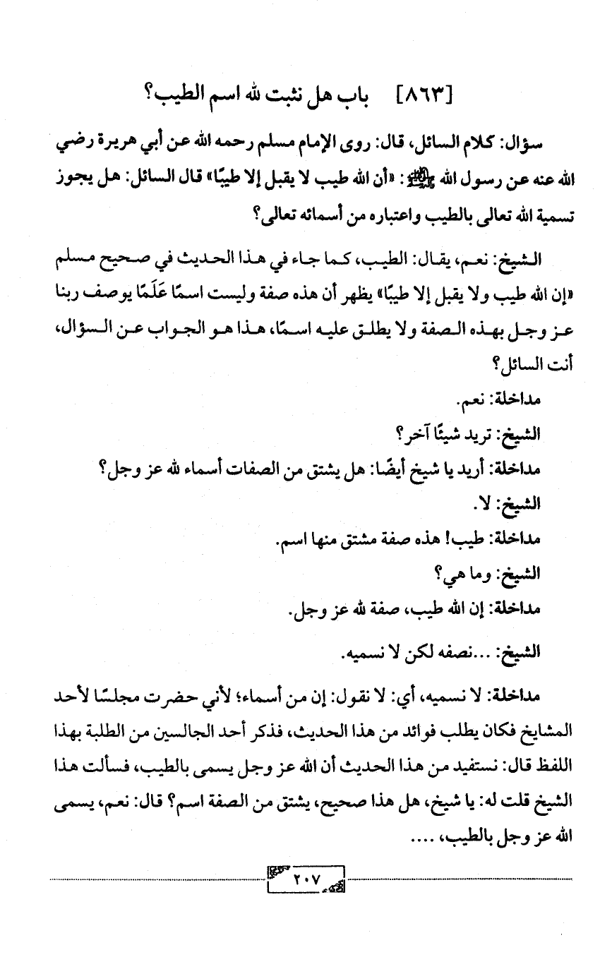 مداخلة: لا نسميه، أي: لا نقول: إن من أسماء؛ لأني حضرت مجلسًا لأحد المشايخ فكان يطلب فوائد من هذا الحديث، فذكر أحد الجالسين من الطلبة بهذا اللفظ قال: نستفيد من هذا الحديث أن الله عز وجل يسمى بالطيب، فسألت هذا الشيخ قلت له: يا شيخ، هل هذا صحيح، يشتق من الصفة اسم؟ قال: نعم، يسمى الله عز وجل بالطيب، ....