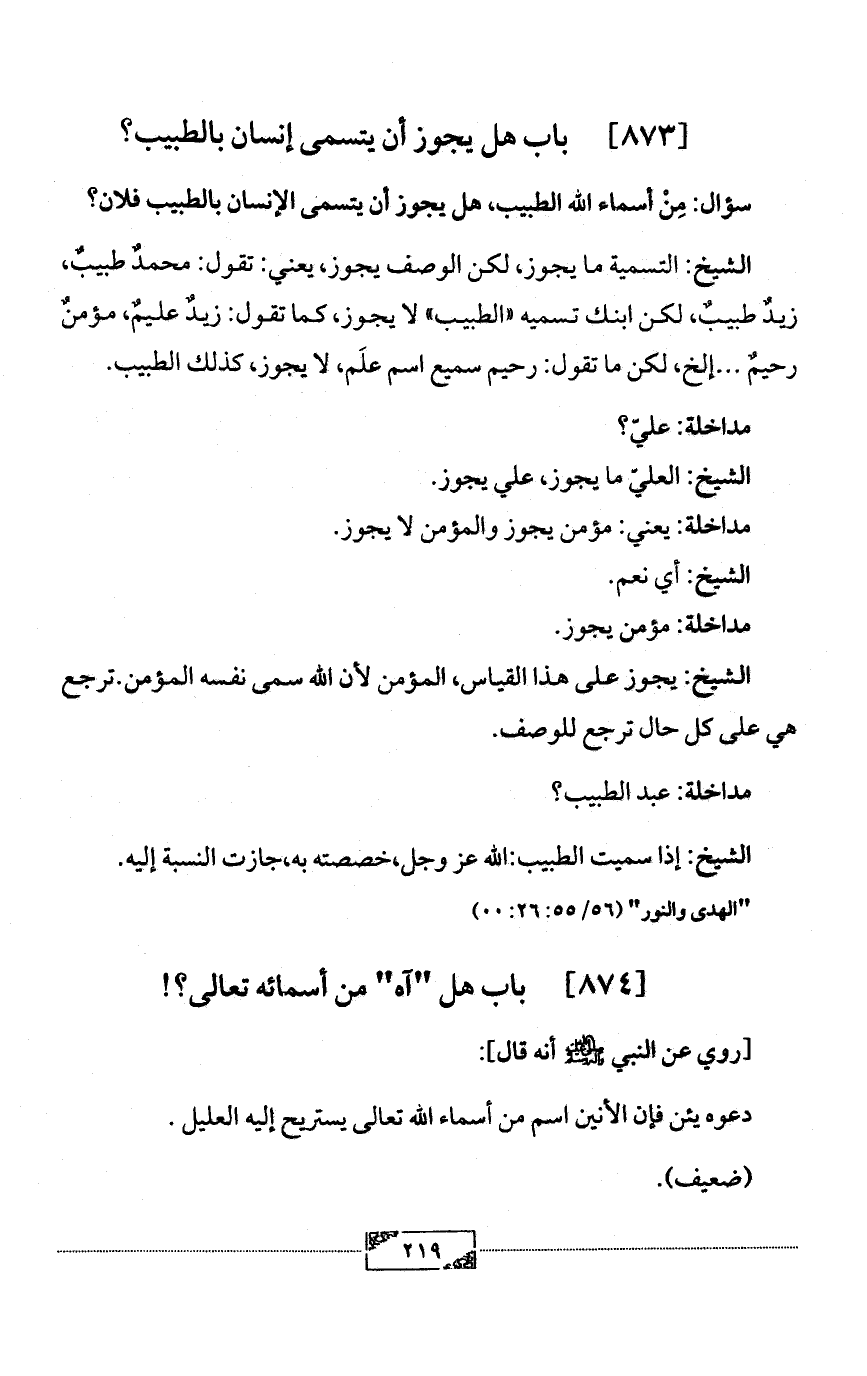 الشيخ: إذا سميت الطبيب: الله عز وجل، خصصته به، جازت النسبة إليه.