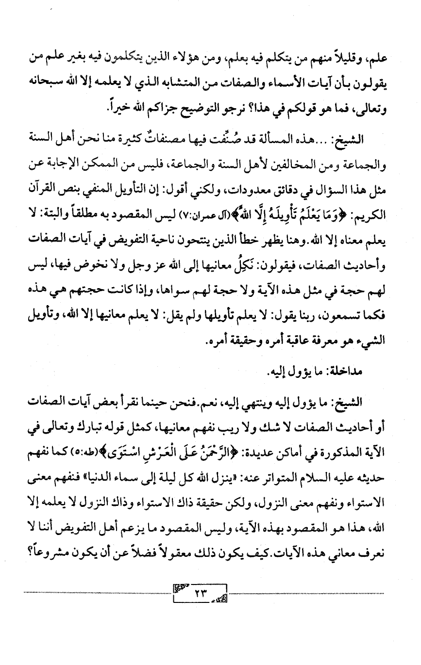 الشيخ: ... هذه المسألة قد صُنِّفت فيها مصنفاتٌ كثيرة منا نحن أهل السنة والجماعة ومن المخالفين لأهل السنة والجماعة، فليس من الممكن الإجابة عن مثل هذا السؤال في دقائق معدودات، ولكني أقول: إن التأويل المنفي بنص القرآن الكريم: {وَمَا يَعْلَمُ تَأْوِيلَهُ إِلَّا اللَّهُ} (آل عمران:7) ليس المقصود به مطلقاً والبتة: لا يعلم معناه إلا الله. وهنا يظهر خطأ الذين ينتحون ناحية التفويض في آيات الصفات وأحاديث الصفات، فيقولون: نَكِلُ معانيها إلى الله عز وجل ولا نخوض فيها، ليس لهم حجة في مثل هذه الآية ولا حجة لهم سواها، وإذا كانت حجتهم هي هذه فكما تسمعون، ربنا يقول: لا يعلم تأويلها ولم يقل: لا يعلم معانيها إلا الله، وتأويل الشيء هو معرفة عاقبة أمره وحقيقة أمره.