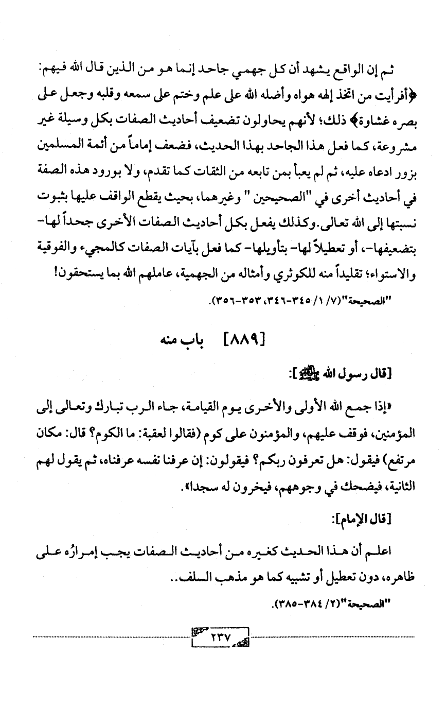ثم إن الواقع يشهد أن كل جهمي جاحد إنما هو من الذين قال الله فيهم: {أفرأيت من اتخذ إلهه هواه وأضله الله على علم وختم على سمعه وقلبه وجعل على بصره غشاوة} ذلك؛ لأنهم يحاولون تضعيف أحاديث الصفات بكل وسيلة غير مشروعة، كما فعل هذا الجاحد بهذا الحديث، فضعف إماماً من أئمة المسلمين بزور ادعاه عليه، ثم لم يعبأ بمن تابعه من الثقات كما تقدم، ولا بورود هذه الصفة في أحاديث أخرى في "الصحيحين " وغيرهما، بحيث يقطع الواقف عليها بثبوت نسبتها إلى الله تعالى. وكذلك يفعل بكل أحاديث الصفات الأخرى جحداً لها- بتضعيفها-، أو تعطيلاً لها- بتأويلها- كما فعل بآيات الصفات كالمجيء والفوقية والاستواء؛ تقليداً منه للكوثري وأمثاله من الجهمية، عاملهم الله بما يستحقون!