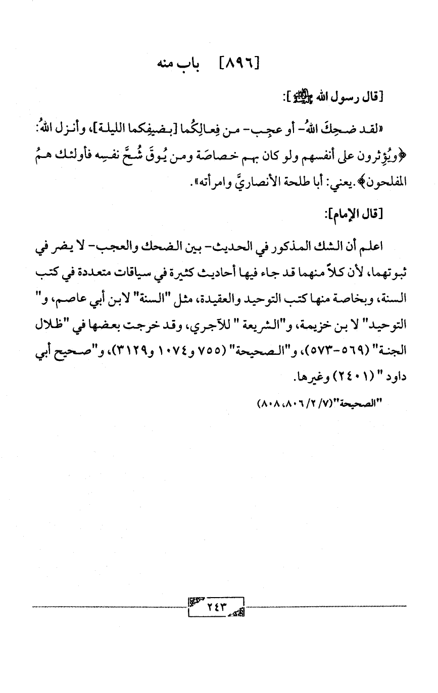 اعلم أن الشك المذكور في الحديث- بين الضحك والعجب- لا يضر في ثبوتهما، لأن كلاً منهما قد جاء فيها أحاديث كثيرة في سياقات متعددة في كتب السنة، وبخاصة منها كتب التوحيد والعقيدة، مثل "السنة" لابن أبي عاصم، و" التوحيد" لا بن خزيمة، و"الشريعة " للآجري، وقد خرجت بعضها في "ظلال الجنة" (569 - 573)، و"الصحيحة" (755 و1074 و3129)، و"صحيح أبي داود " (2401) وغيرها.
