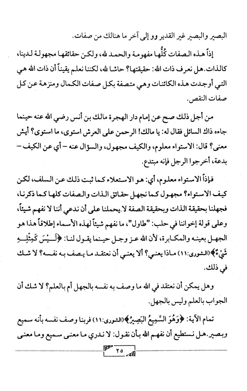 تمام الآية: {وَهُوَ السَّمِيعُ البَصِيرُ} (الشورى:11) فربنا وصف نفسه بأنه سميع وبصير. هل نستطيع أن نفهم الله بأن نقول: لا ندري ما معنى سميع وما معنى