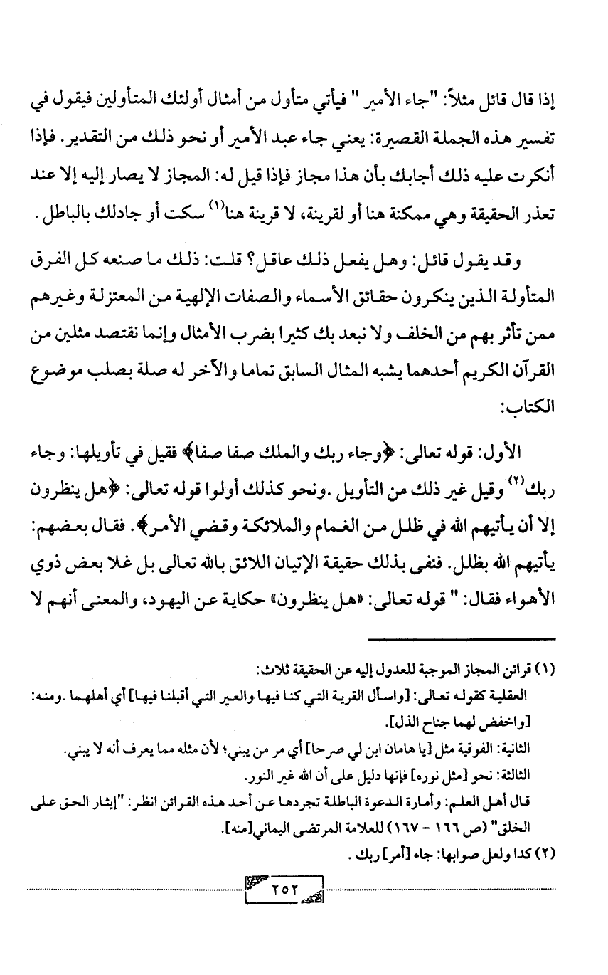 إذا قال قائل مثلاً: "جاء الأمير " فيأتي متأول من أمثال أولئك المتأولين فيقول في تفسير هذه الجملة القصيرة: يعني جاء عبد الأمير أو نحو ذلك من التقدير. فإذا أنكرت عليه ذلك أجابك بأن هذا مجاز فإذا قيل له: المجاز لا يصار إليه إلا عند تعذر الحقيقة وهي ممكنة هنا أو لقرينة, لا قرينة هنا (¬1) سكت أو جادلك بالباطل.