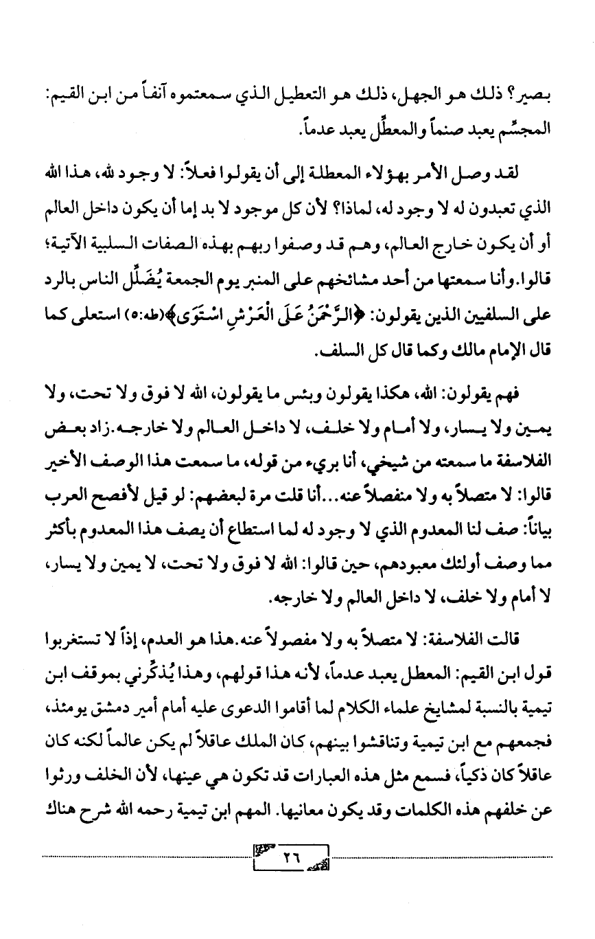 فهم يقولون: الله، هكذا يقولون وبئس ما يقولون, الله لا فوق ولا تحت, ولا يمين ولا يسار, ولا أمام ولا خلف، لا داخل العالم ولا خارجه. زاد بعض الفلاسفة ما سمعته من شيخي، أنا بريء من قوله, ما سمعت هذا الوصف الأخير قالوا: لا متصلاً به ولا منفصلاً عنه ... أنا قلت مرة لبعضهم: لو قيل لأفصح العرب بياناً: صف لنا المعدوم الذي لا وجود له لما استطاع أن يصف هذا المعدوم بأكثر مما وصف أولئك معبودهم، حين قالوا: الله لا فوق ولا تحت، لا يمين ولا يسار، لا أمام ولا خلف، لا داخل العالم ولا خارجه.