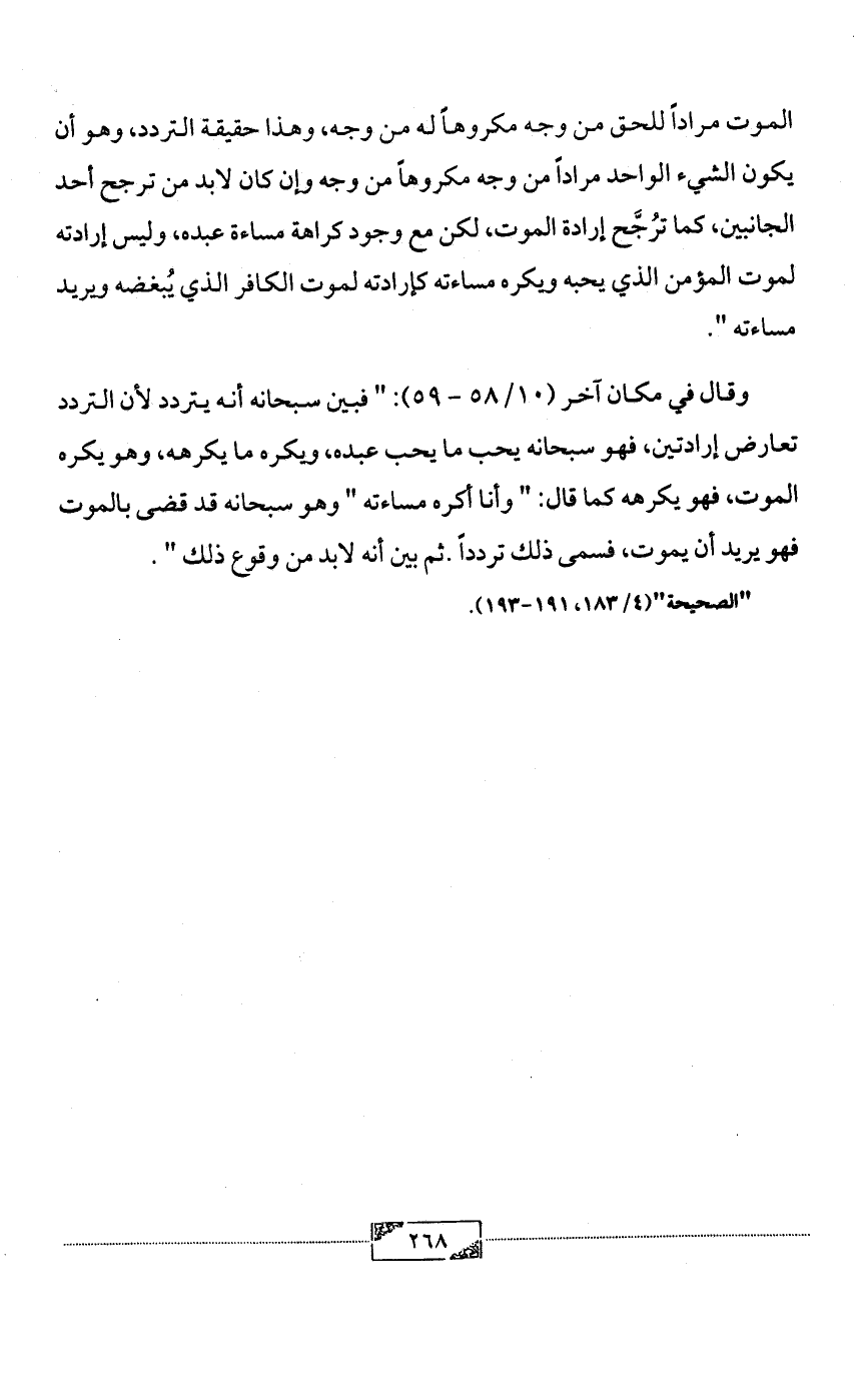 وقال في مكان آخر (10/ 58 - 59): " فبين سبحانه أنه يتردد لأن التردد تعارض إرادتين، فهو سبحانه يحب ما يحب عبده، ويكره ما يكرهه، وهو يكره الموت، فهو يكرهه كما قال: " وأنا أكره مساءته " وهو سبحانه قد قضى بالموت فهو يريد أن يموت، فسمى ذلك تردداً. ثم بين أنه لابد من وقوع ذلك ".