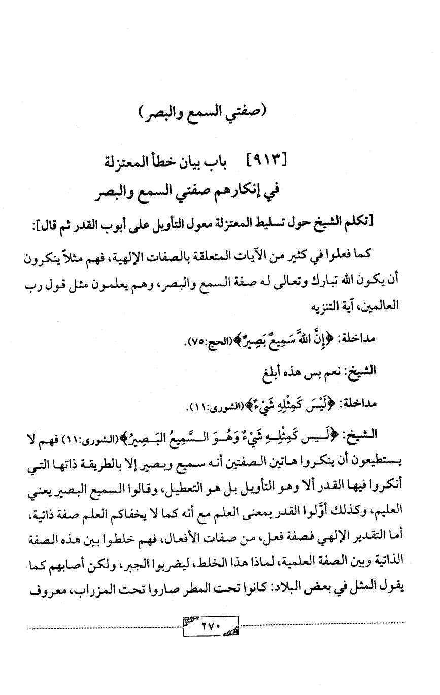 الشيخ: {لَيس كَمِثْلِهِ شَيْءٌ وَهُوَ السَّمِيعُ البَصِيرُ} (الشورى:11) فهم لا يستطيعون أن ينكروا هاتين الصفتين أنه سميع وبصير إلا بالطريقة ذاتها التي أنكروا فيها القدر ألا وهو التأويل بل هو التعطيل، وقالوا السميع البصير يعني العليم، وكذلك أوَّلوا القدر بمعنى العلم مع أنه كما لا يخفاكم العلم صفة ذاتية، أما التقدير الإلهي فصفة فعل، من صفات الأفعال، فهم خلطوا بين هذه الصفة الذاتية وبين الصفة العلمية، لماذا هذا الخلط، ليضربوا الجبر، ولكن أصابهم كما يقول المثل في بعض البلاد: كانوا تحت المطر صاروا تحت المزراب، معروف