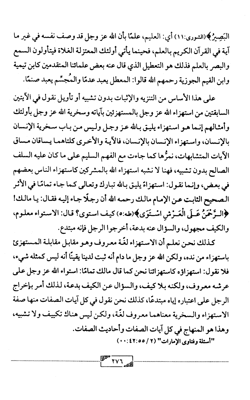 كذلك نحن نعلم أن الاستهزاء لغًة معروف وهو مقابل مقابلة المستهزئ باستهزاء من نده، ولكن الله عز وجل ما دام أنه ثبت لدينا يقينًا أنه ليس كمثله شيء، فلا نقول: استهزاؤه كاستهزائنا نحن كما قال مالك تمامًا: استواء الله عز وجل على عرشه معروف، ولكنه بلا كيف، والسؤال عن الكيف بدعة، لذلك أمر بإخراج الرجل على اعتباره إياه مبتدعًا، كذلك نحن نقول في كل آيات الصفات منها صفة الاستهزاء والسخرية معناهما معروف لغًة، ولكن ليس هناك تكييف ولا تشبيه، وهذا هو المنهاج في كل آيات الصفات وأحاديث الصفات.