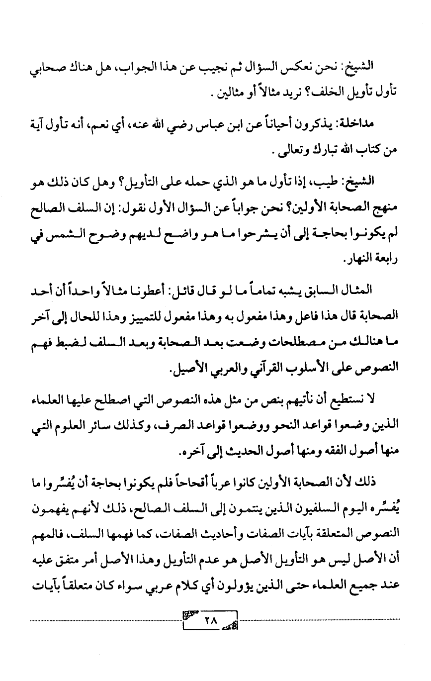 الشيخ: نحن نعكس السؤال ثم نجيب عن هذا الجواب, هل هناك صحابي تأول تأويل الخلف؟ نريد مثالاً أو مثالين.