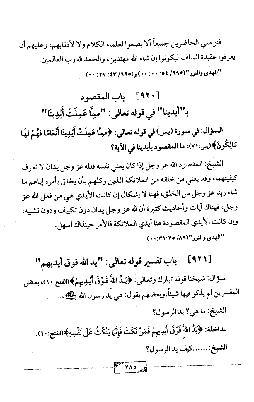 فنوصي الحاضرين جميعاً ألا يصغوا لعلماء الكلام ولا لأذنابهم، وعليهم أن يعرفوا عقيدة السلف ليكونوا إن شاء الله مهتدين، والحمد لله رب العالمين.