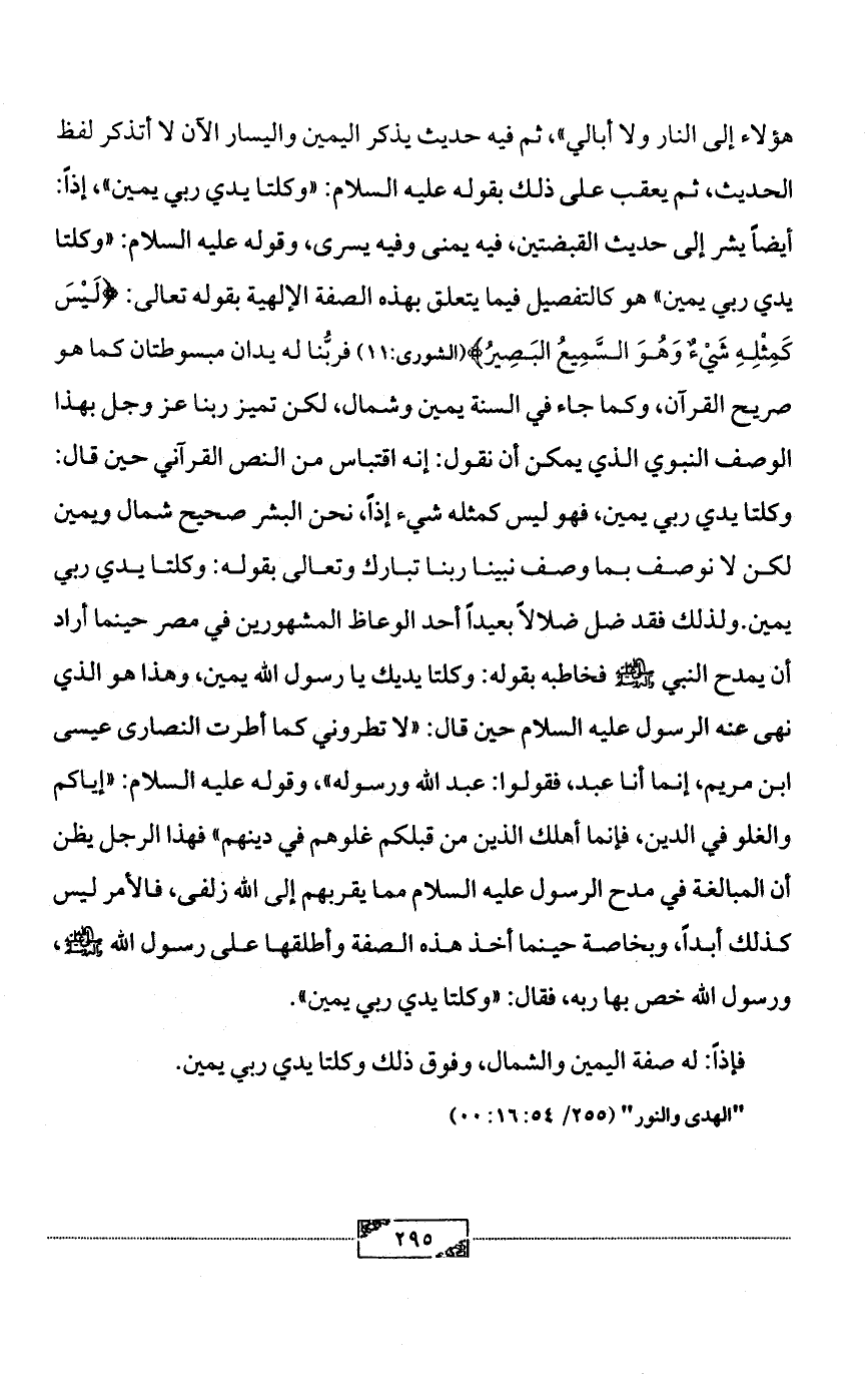 هؤلاء إلى النار ولا أبالي»، ثم فيه حديث يذكر اليمين واليسار الآن لا أتذكر لفظ الحديث، ثم يعقب على ذلك بقوله عليه السلام: «وكلتا يدي ربي يمين»، إذاً: أيضاً يشر إلى حديث القبضتين، فيه يمنى وفيه يسرى، وقوله عليه السلام: «وكلتا يدي ربي يمين» هو كالتفصيل فيما يتعلق بهذه الصفة الإلهية بقوله تعالى: {لَيْسَ كَمِثْلِهِ شَيْءٌ وَهُوَ السَّمِيعُ البَصِيرُ} (الشورى:11) فربُّنا له يدان مبسوطتان كما هو صريح القرآن، وكما جاء في السنة يمين وشمال، لكن تميز ربنا عز وجل بهذا الوصف النبوي الذي يمكن أن نقول: إنه اقتباس من النص القرآني حين قال: وكلتا يدي ربي يمين، فهو ليس كمثله شيء إذاً، نحن البشر صحيح شمال ويمين لكن لا نوصف بما وصف نبينا ربنا تبارك وتعالى بقوله: وكلتا يدي ربي يمين. ولذلك فقد ضل ضلالاً بعيداً أحد الوعاظ المشهورين في مصر حينما أراد أن يمدح النبي - صلى الله عليه وآله وسلم - فخاطبه بقوله: وكلتا يديك يا رسول الله يمين، وهذا هو الذي نهى عنه الرسول عليه السلام حين قال: «لا تطروني كما أطرت النصارى عيسى ابن مريم، إنما أنا عبد، فقولوا: عبد الله ورسوله»، وقوله عليه السلام: «إياكم والغلو في الدين، فإنما أهلك الذين من قبلكم غلوهم في دينهم» فهذا الرجل يظن أن المبالغة في مدح الرسول عليه السلام مما يقربهم إلى الله زلفى، فالأمر ليس كذلك أبداً، وبخاصة حينما أخذ هذه الصفة وأطلقها على رسول الله - صلى الله عليه وآله وسلم -، ورسول الله خص بها ربه، فقال: «وكلتا يدي ربي يمين».