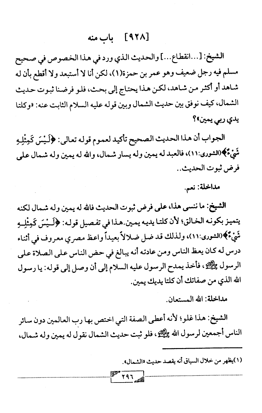 الشيخ: ما ننسى هذا، على فرض ثبوت الحديث فالله له يمين وله شمال لكنه يتميز بكونه الخالق؛ لأن كلتا يديه يمين. هذا في تفصيل قوله: {لَيْسَ كَمِثْلِهِ شَيْءٌ} (الشورى:11)، ولذلك قد ضل ضلالاً بعيداً واعظ مصري معروف في أثناء درس له كان يعظ الناس ومن عادته أنه يبالغ في حض الناس على الصلاة على الرسول - صلى الله عليه وآله وسلم -، فأخذ يمدح الرسول عليه السلام إلى أن وصل إلى قوله: يا رسول الله الذي من صفاتك أن كلتا يديك يمين.