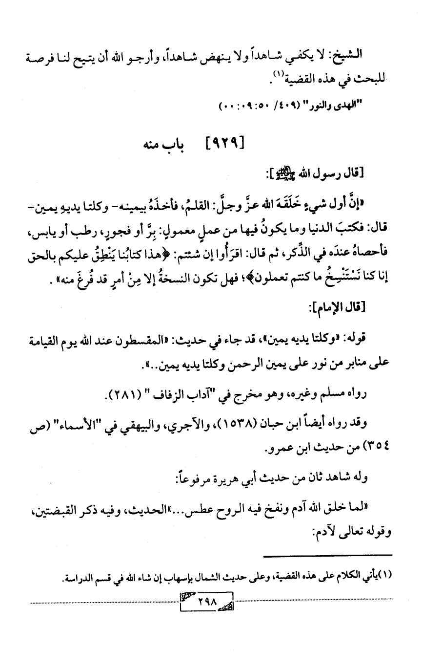 «إنَّ أول شيءٍ خَلَقَهَ الله عزَّ وجلَّ: القلمُ، فأخذَهُ بيمينه- وكلتا يديهِ يمين- قال: فكتبَ الدنيا وما يكونُ فيها من عملٍ معمولٍ: بِرَّ أو فجورٍ، رطب أو يابس، فأحصاهُ عندَه في الذِّكر، ثم قال: اقرَأُوا إن شئتم: {هذا كتابُنا يَنْطِقُ عليكم بالحق إنا كنا نَسْتَنْسِخُ ما كنتم تعملون}؛ فهل تكون النسخةُ إلا مِنْ أمرٍ قد فُرغَ منه».