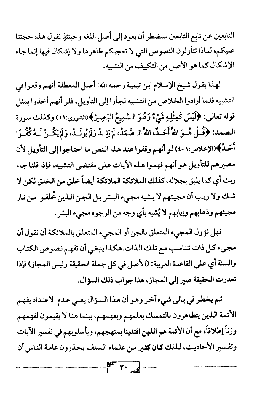 التابعين عن تابع التابعين سيضطر أن يعود إلى أصل اللغة وحينئذٍ نقول هذه حجتنا عليكم، لماذا تتأولون النصوص التي لا تعجبكم ظاهرها ولا إشكال فيها إنما جاء الإشكال كما هو الأصل من التكييف من التشبيه.