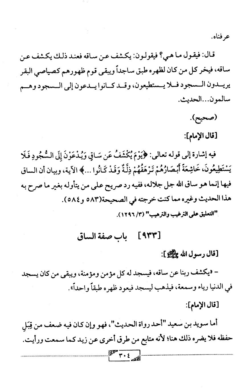 فيه إشارة إلى قوله تعالى: {يَوْمَ يُكْشَفُ عَن سَاقٍ وَيُدْعَوْنَ إِلَى السُّجُودِ فَلَا يَسْتَطِيعُونَ، خَاشِعَةً أَبْصَارُهُمْ تَرْهَقُهُمْ ذِلَّةٌ وَقَدْ كَانُوا ... } الآية، وبيان أن الساق فيها إنما هو ساق الله جل جلاله، ففيه رد صريح على من يتأوله بغير ما صرح به هذا الحديث وغيره مما كنت خرجته في الصحيحة (583 و584).
