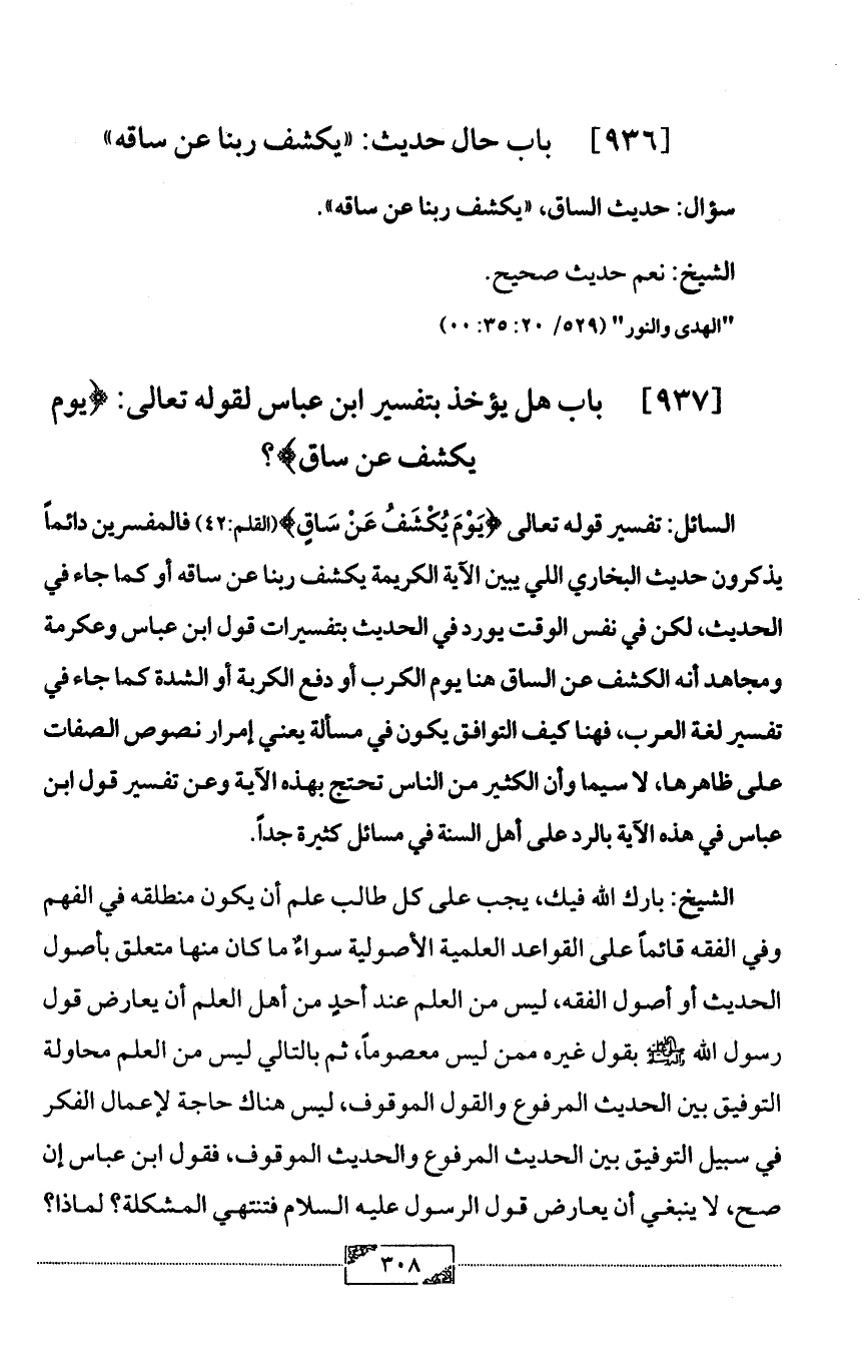 السائل: تفسير قوله تعالى {يَوْمَ يُكْشَفُ عَنْ سَاقٍ} (القلم:42) فالمفسرين دائماً يذكرون حديث البخاري اللي يبين الآية الكريمة يكشف ربنا عن ساقه أو كما جاء في الحديث، لكن في نفس الوقت يورد في الحديث بتفسيرات قول ابن عباس وعكرمة ومجاهد أنه الكشف عن الساق هنا يوم الكرب أو دفع الكربة أو الشدة كما جاء في تفسير لغة العرب، فهنا كيف التوافق يكون في مسألة يعني إمرار نصوص الصفات على ظاهرها، لا سيما وأن الكثير من الناس تحتج بهذه الآية وعن تفسير قول ابن عباس في هذه الآية بالرد على أهل السنة في مسائل كثيرة جداً.