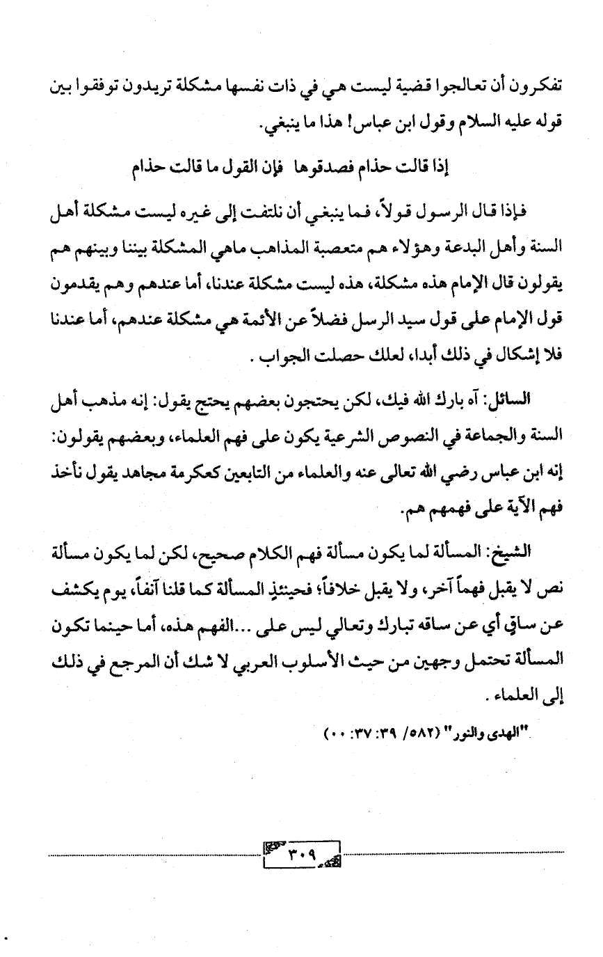 الشيخ: المسألة لما يكون مسألة فهم الكلام صحيح، لكن لما يكون مسألة نص لا يقبل فهماً آخر، ولا يقبل خلافاً؛ فحينئذٍ المسألة كما قلنا آنفاً، يوم يكشف عن ساقٍ أي عن ساقه تبارك وتعالي ليس على ... الفهم هذه، أما حينما تكون المسألة تحتمل وجهين من حيث الأسلوب العربي لا شك أن المرجع في ذلك إلى العلماء.
