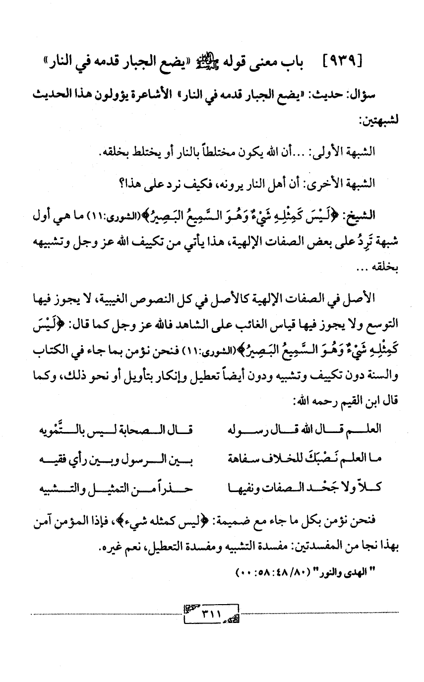 [939] باب معنى قوله - صلى الله عليه وآله وسلم - «يضع الجبار قدمه في النار»