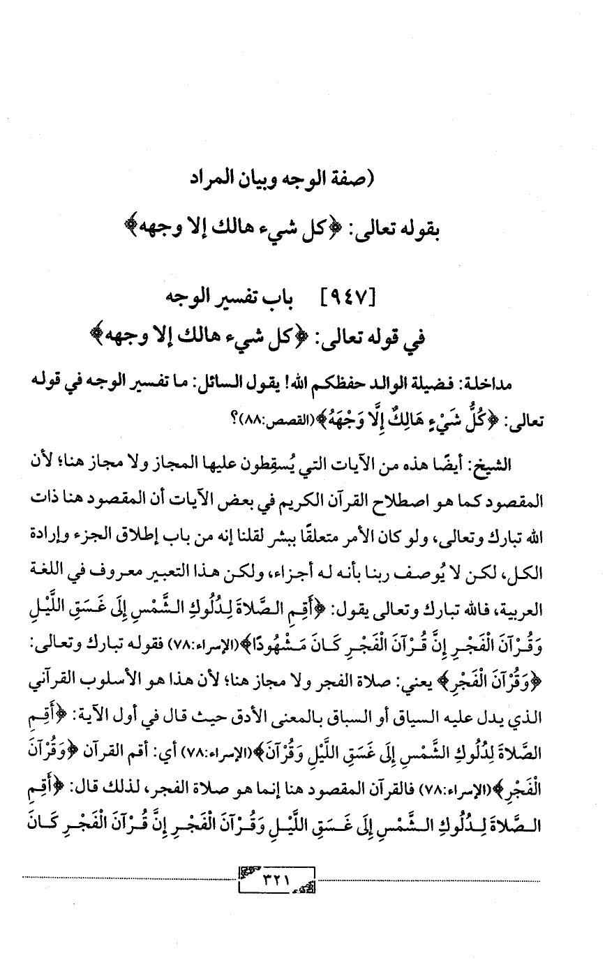 الشيخ: أيضًا هذه من الآيات التي يُسقِطون عليها المجاز ولا مجاز هنا؛ لأن المقصود كما هو اصطلاح القرآن الكريم في بعض الآيات أن المقصود هنا ذات الله تبارك وتعالى، ولو كان الأمر متعلقًا ببشر لقلنا إنه من باب إطلاق الجزء وإرادة الكل، لكن لا يُوصف ربنا بأنه له أجزاء، ولكن هذا التعبير معروف في اللغة العربية، فالله تبارك وتعالى يقول: {أَقِمِ الصَّلاةَ لِدُلُوكِ الشَّمْسِ إِلَى غَسَقِ اللَّيْلِ وَقُرْآنَ الْفَجْرِ إِنَّ قُرْآنَ الْفَجْرِ كَانَ مَشْهُودًا} (الإسراء:78) فقوله تبارك وتعالى: {وَقُرْآنَ الْفَجْرِ} يعني: صلاة الفجر ولا مجاز هنا؛ لأن هذا هو الأسلوب القرآني الذي يدل عليه السياق أو السباق بالمعنى الأدق حيث قال في أول الآية: {أَقِمِ الصَّلاةَ لِدُلُوكِ الشَّمْسِ إِلَى غَسَقِ اللَّيْلِ وَقُرْآنَ} (الإسراء:78) أي: أقم القرآن {وَقُرْآنَ الْفَجْرِ} (الإسراء:78) فالقرآن المقصود هنا إنما هو صلاة الفجر، لذلك قال: {أَقِمِ الصَّلاةَ لِدُلُوكِ الشَّمْسِ إِلَى غَسَقِ اللَّيْلِ وَقُرْآنَ الْفَجْرِ إِنَّ قُرْآنَ الْفَجْرِ كَانَ