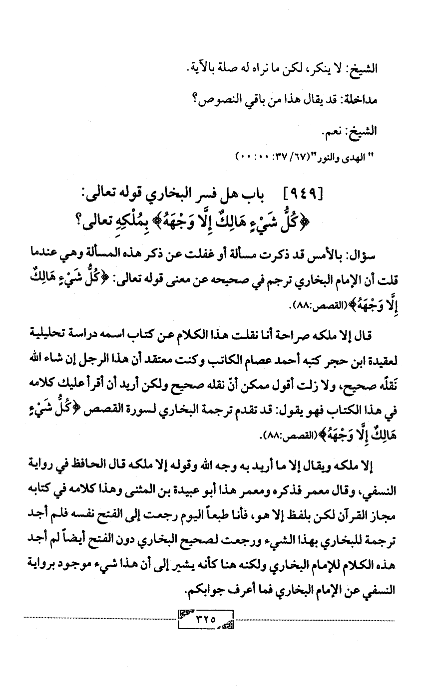 سؤال: بالأمس قد ذكرت مسألة أو غفلت عن ذكر هذه المسألة وهي عندما قلت أن الإمام البخاري ترجم في صحيحه عن معنى قوله تعالى: {كُلُّ شَيْءٍ هَالِكٌ إِلَّا وَجْهَهُ} (القصص:88).