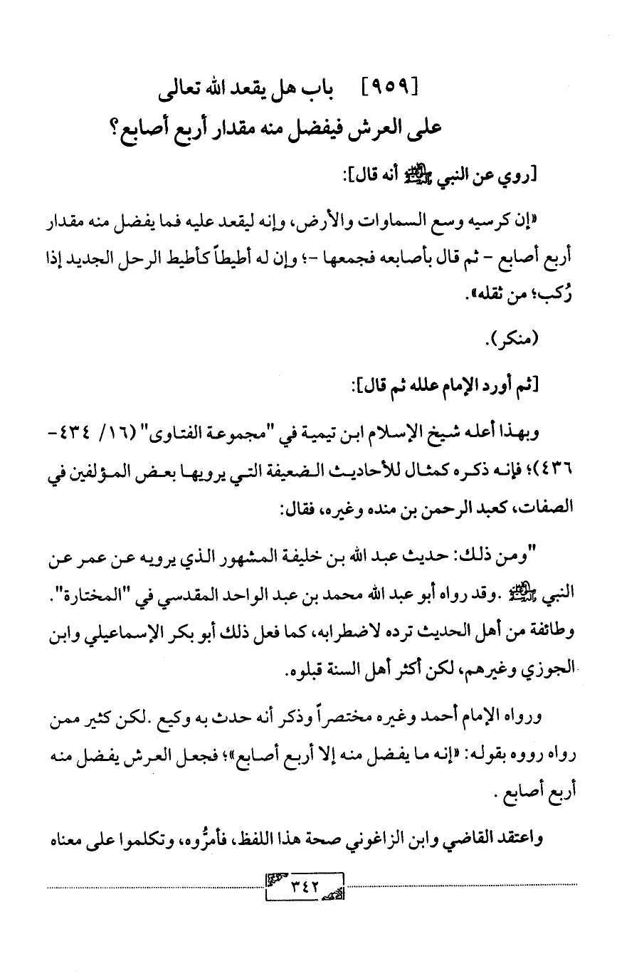 «إن كرسيه وسع السماوات والأرض، وإنه ليقعد عليه فما يفضل منه مقدار أربع أصابع - ثم قال بأصابعه فجمعها -؛ وإن له أطيطاً كأطيط الرحل الجديد إذا رُكب؛ من ثقله».