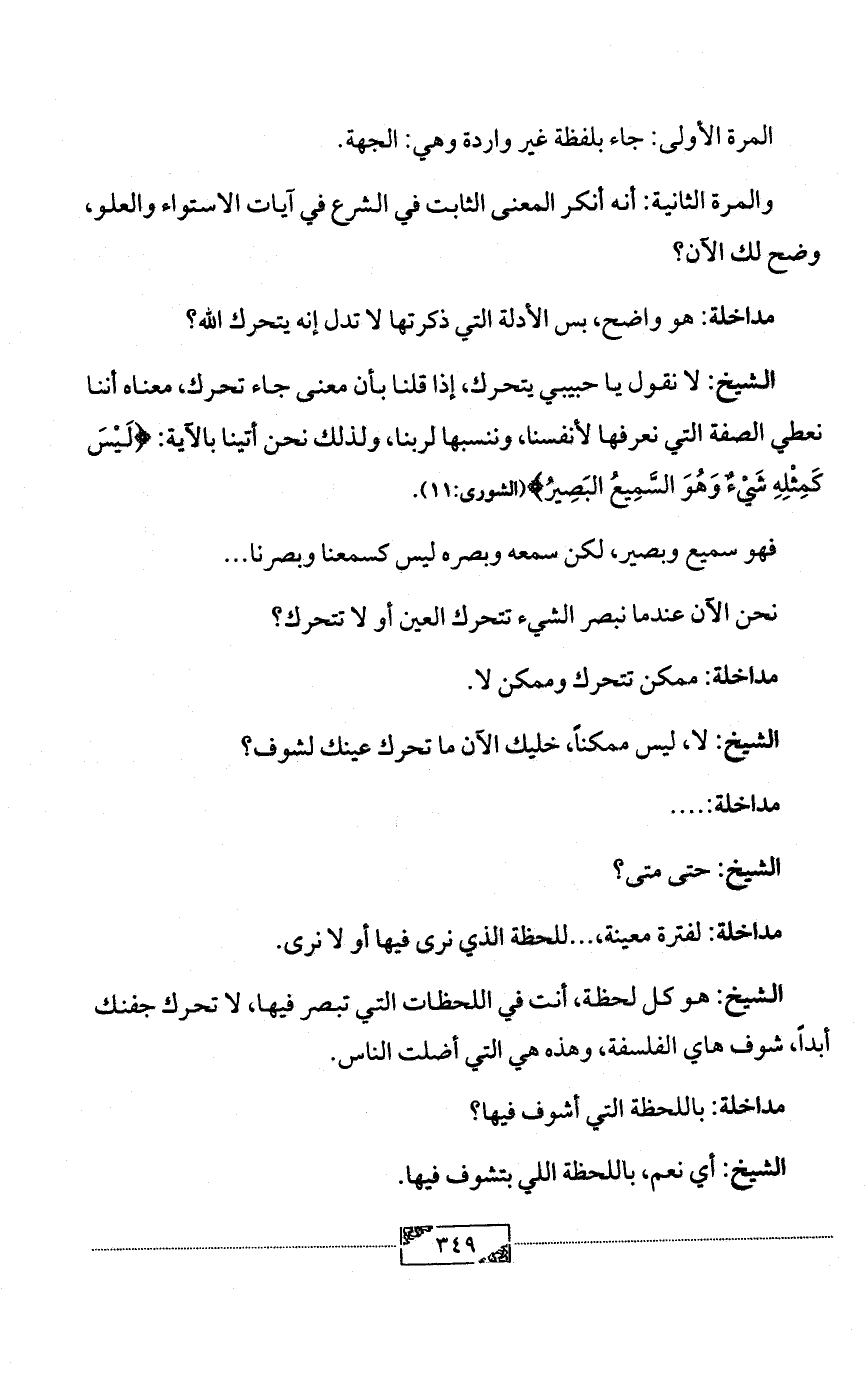 الشيخ: هو كل لحظة، أنت في اللحظات التي تبصر فيها، لا تحرك جفنك أبداً، شوف هاي الفلسفة، وهذه هي التي أضلت الناس.